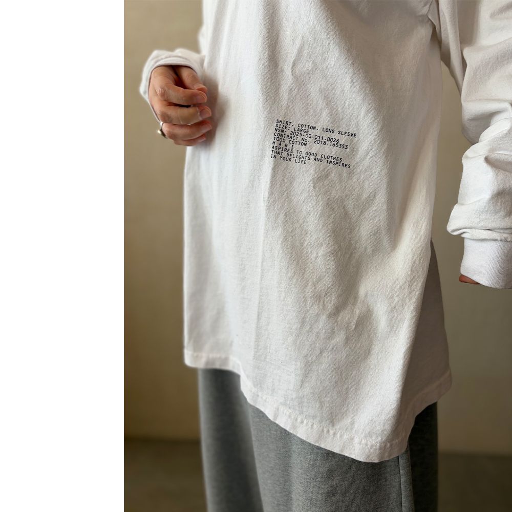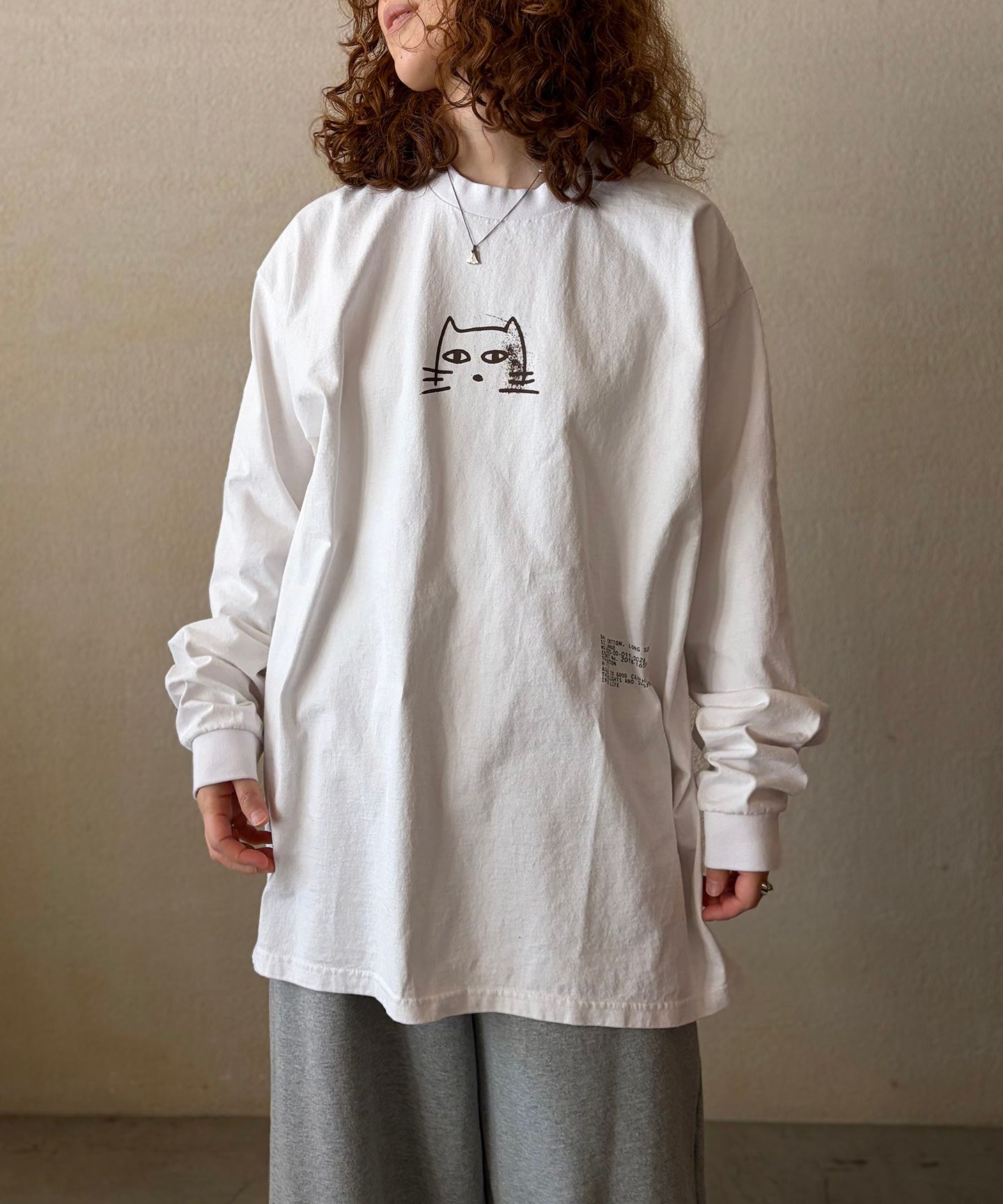 古着のような洗い加工を施した、オーバーサイズのロングスリーブTシャツ。フロントの猫プリントと、裾のミリタリー調プリントのミスマッチが特徴的な一枚です。(※luxe別注商品)