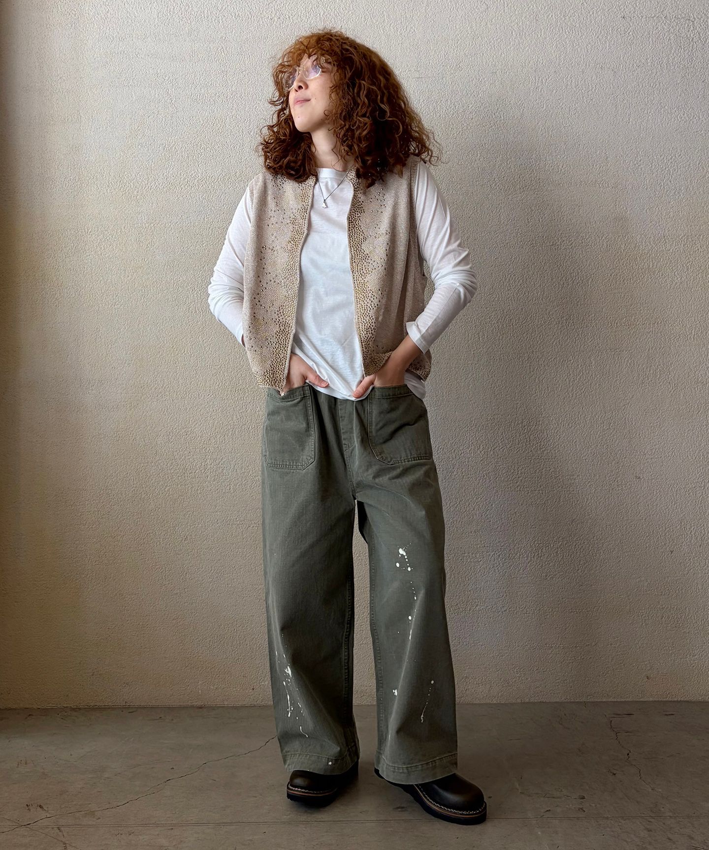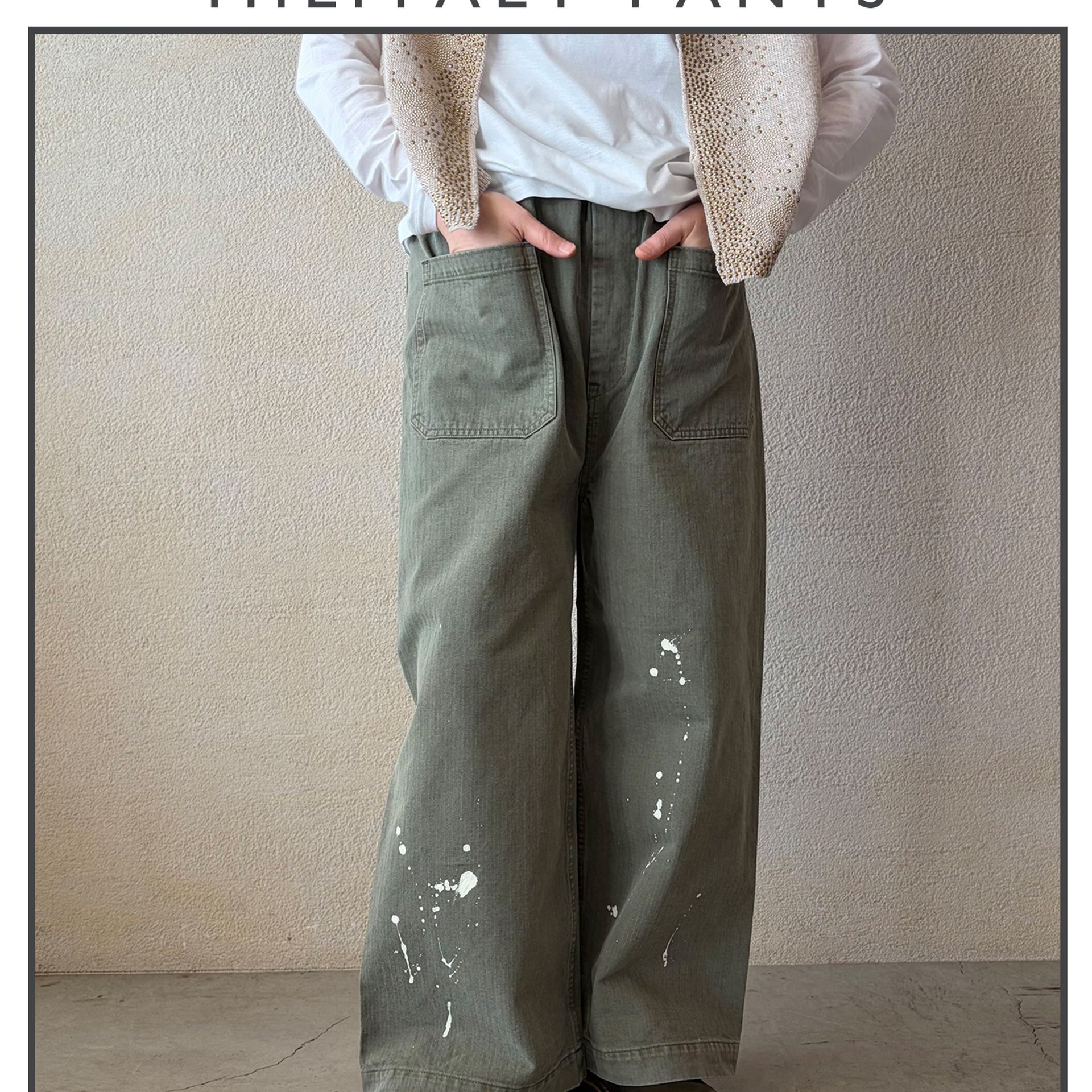 ミリタリー定番の素材であるヘリンボーンツイルを使用した、ワイドシルエットのイージーパンツ。岡山の加工工場でヴィンテージ加工を加え、まるで古着のような雰囲気に仕上げました。(※luxe別注商品)