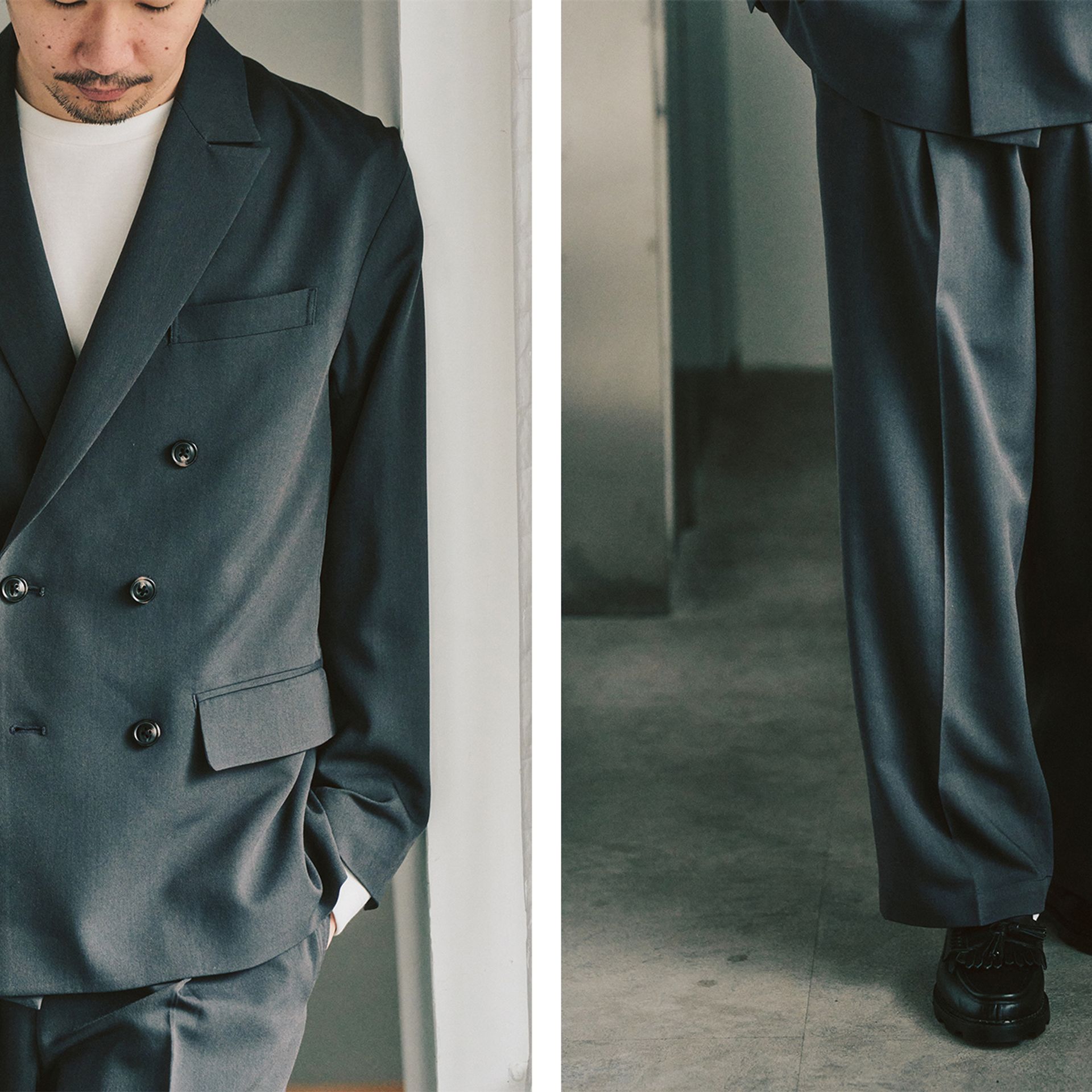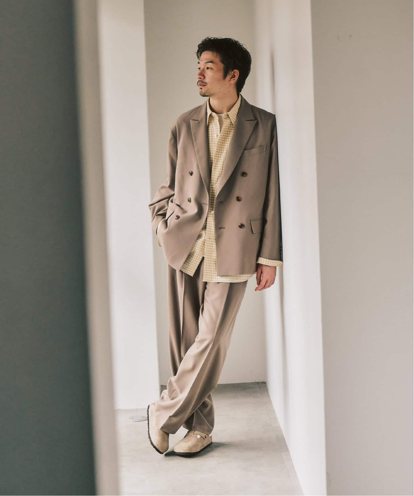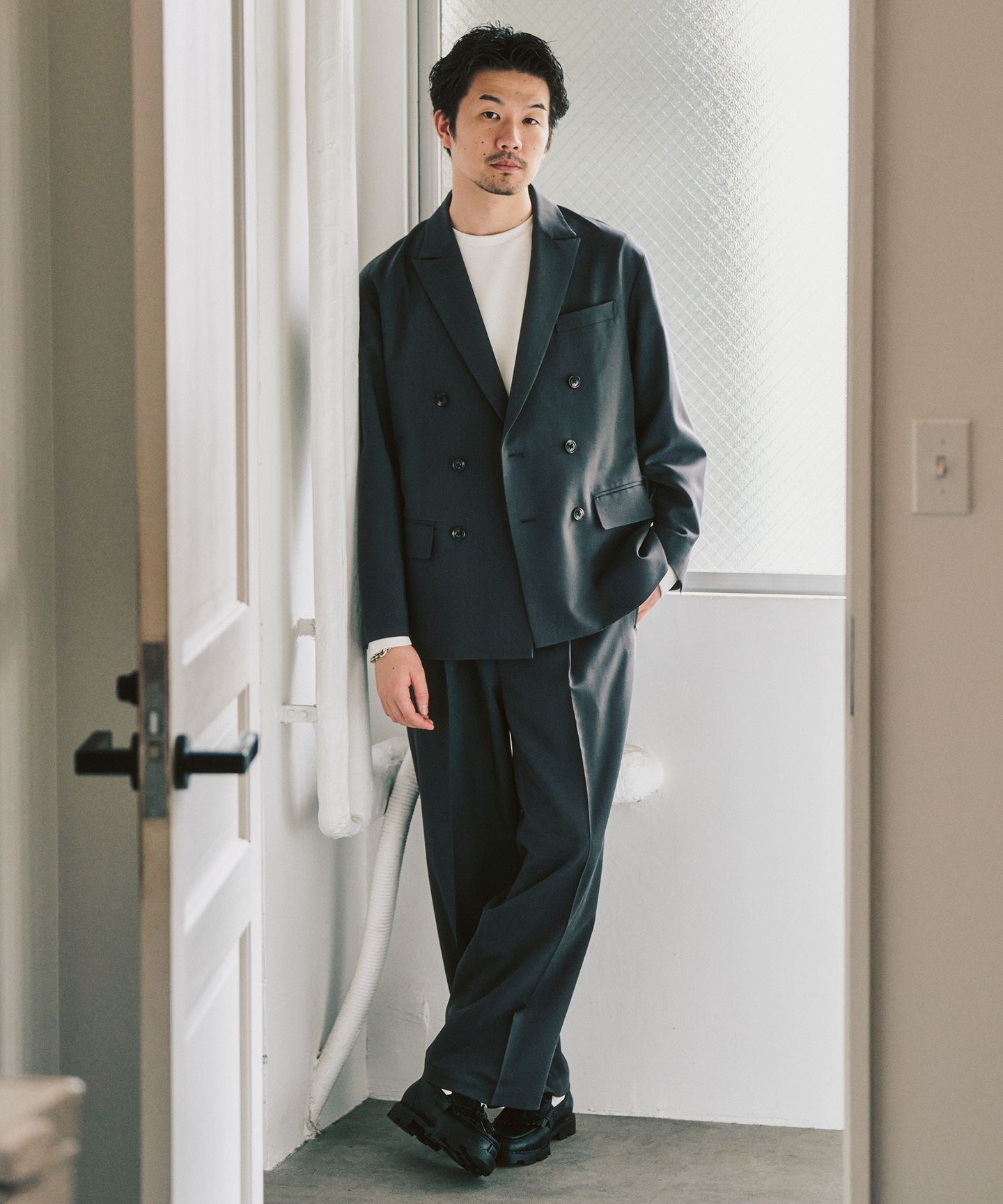 ダブルのセットアップと聞くと、少し構えてしまう方もいるかもしれません。このモデルは、トレンドのワイドシルエットとTR素材の落ち感によって、スーツ感が出すぎず、日常に自然と馴染むバランスに仕上がっています。