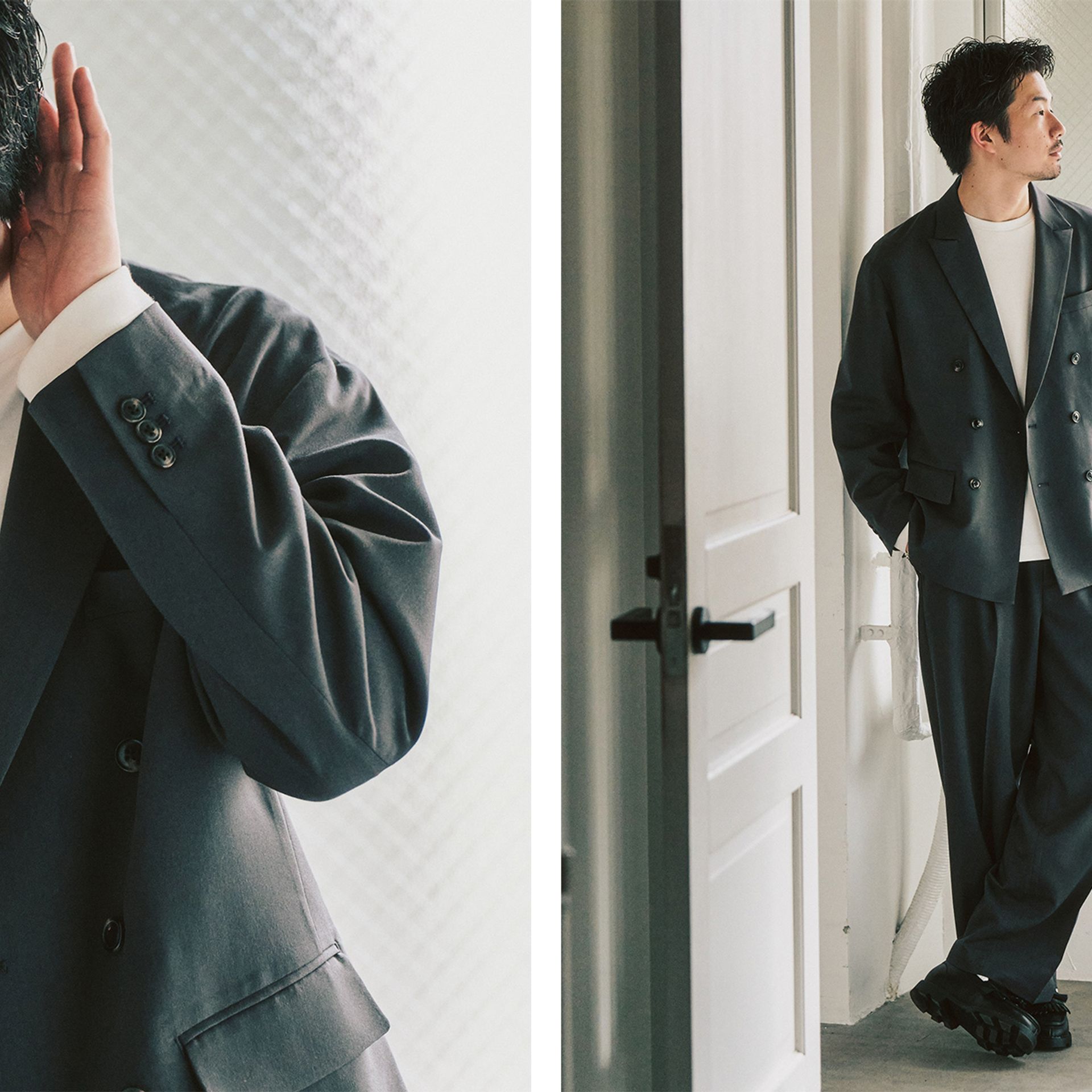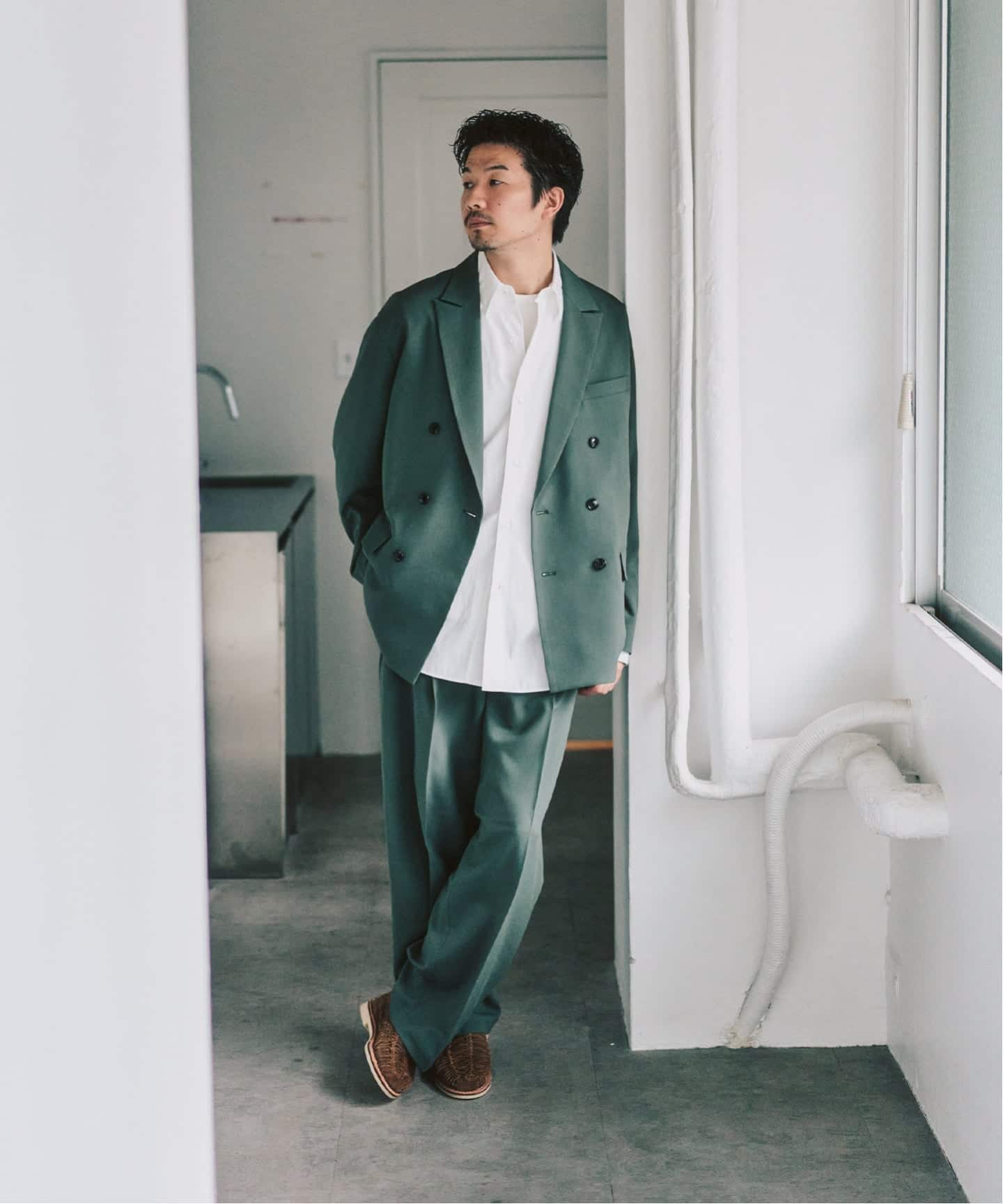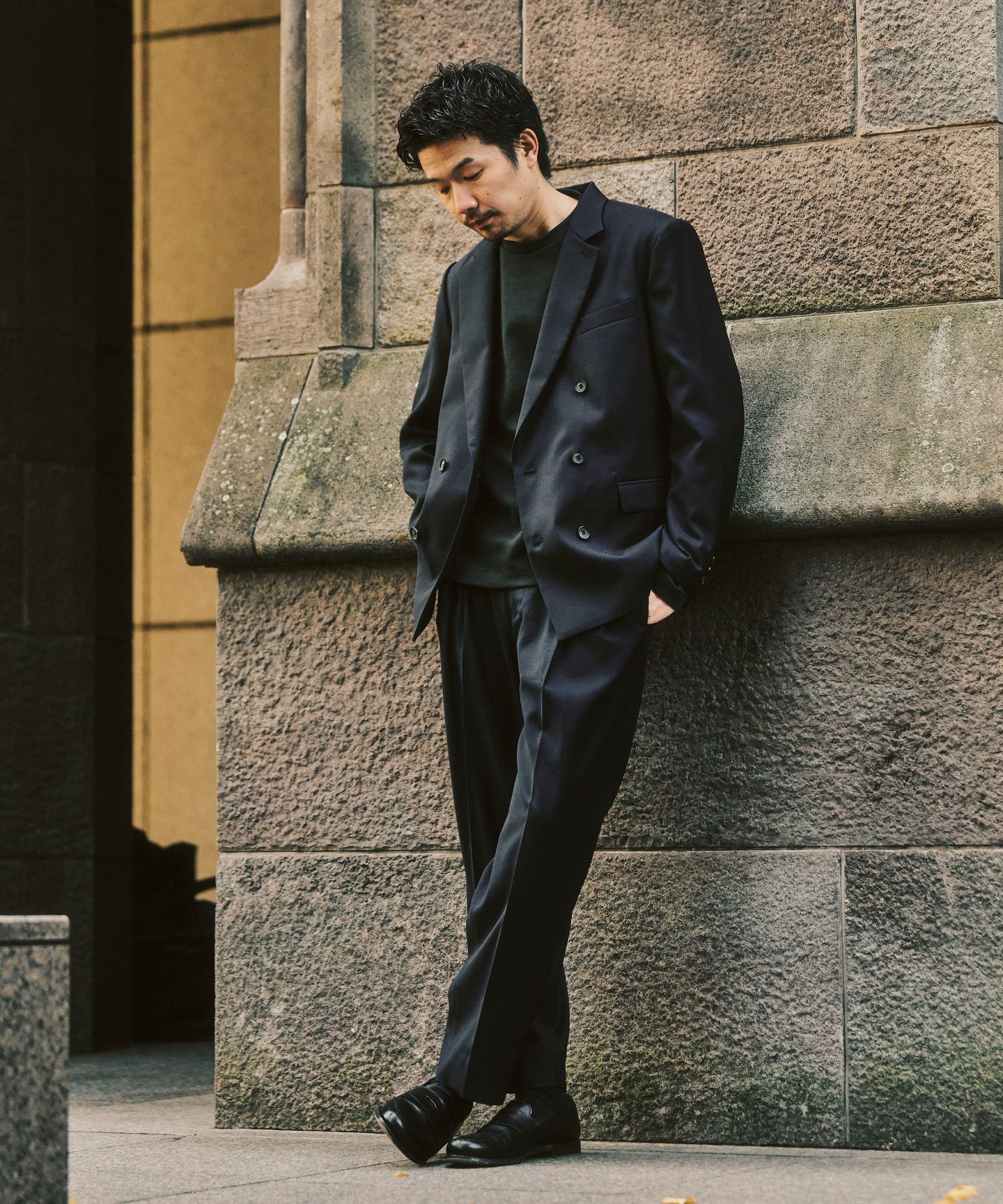 ダブルのセットアップと聞くと、少し構えてしまう方もいるかもしれません。このモデルは、トレンドのワイドシルエットとTR素材の落ち感によって、スーツ感が出すぎず、日常に自然と馴染むバランスに仕上がっています。