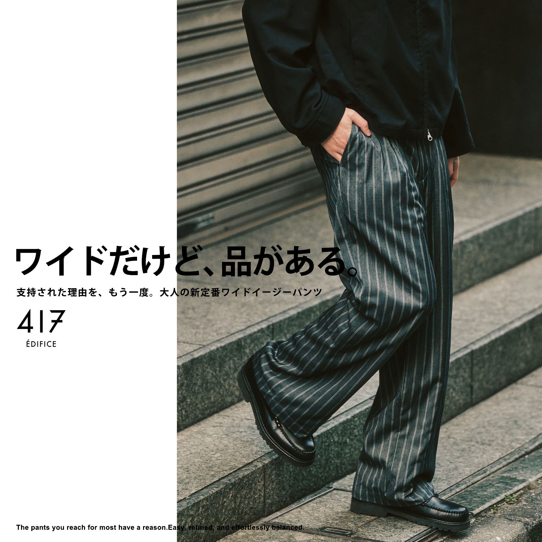 ビジネスシーンで求められるきちんと感を備えながら、日常にも取り入れやすいバランスで選ばれてきたのが、417の定番セットアップシリーズです。