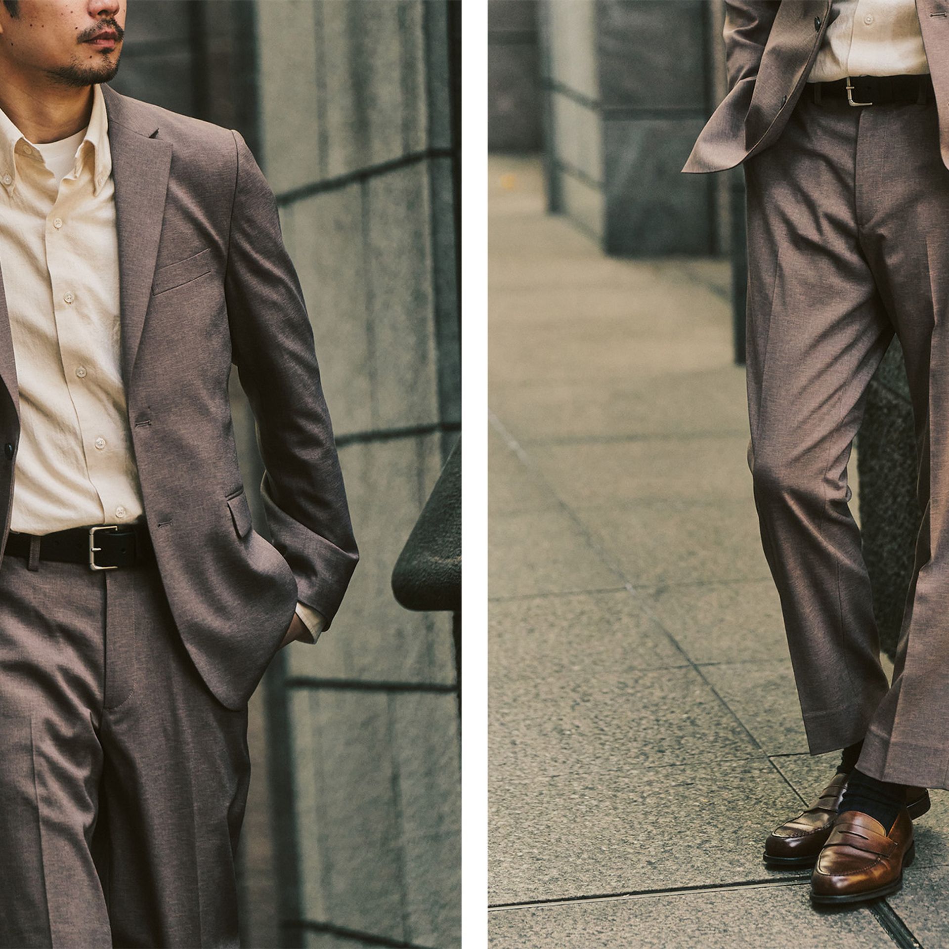 このセットアップは、仕事でも普段でも、シーンを問わず使える汎用性の高さから、長く選ばれ続けている定番的な存在。