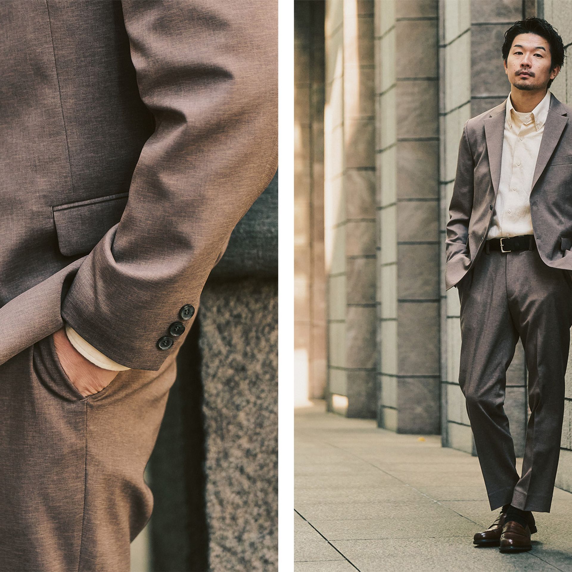 シャツを合わせて仕事に使うのはもちろん、急なオケージョンシーンにもそのまま対応できる。かしこまりすぎないのに、きちんと見える。そのバランスが、日常と仕事を行き来しやすくしています。セット売りなので、迷わず選べて、すぐに使えるのもポイント。「まず一着持っておきたいセットアップ」としても、「結局これに戻ってくる一着」としても、納得感のあるモデルです。