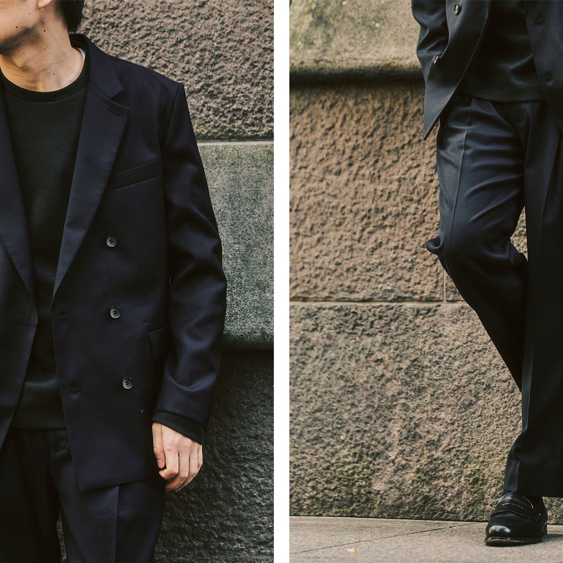 こちらはダブルのセットアップながら、よりきれいめ・端正な印象で着られるモデル。