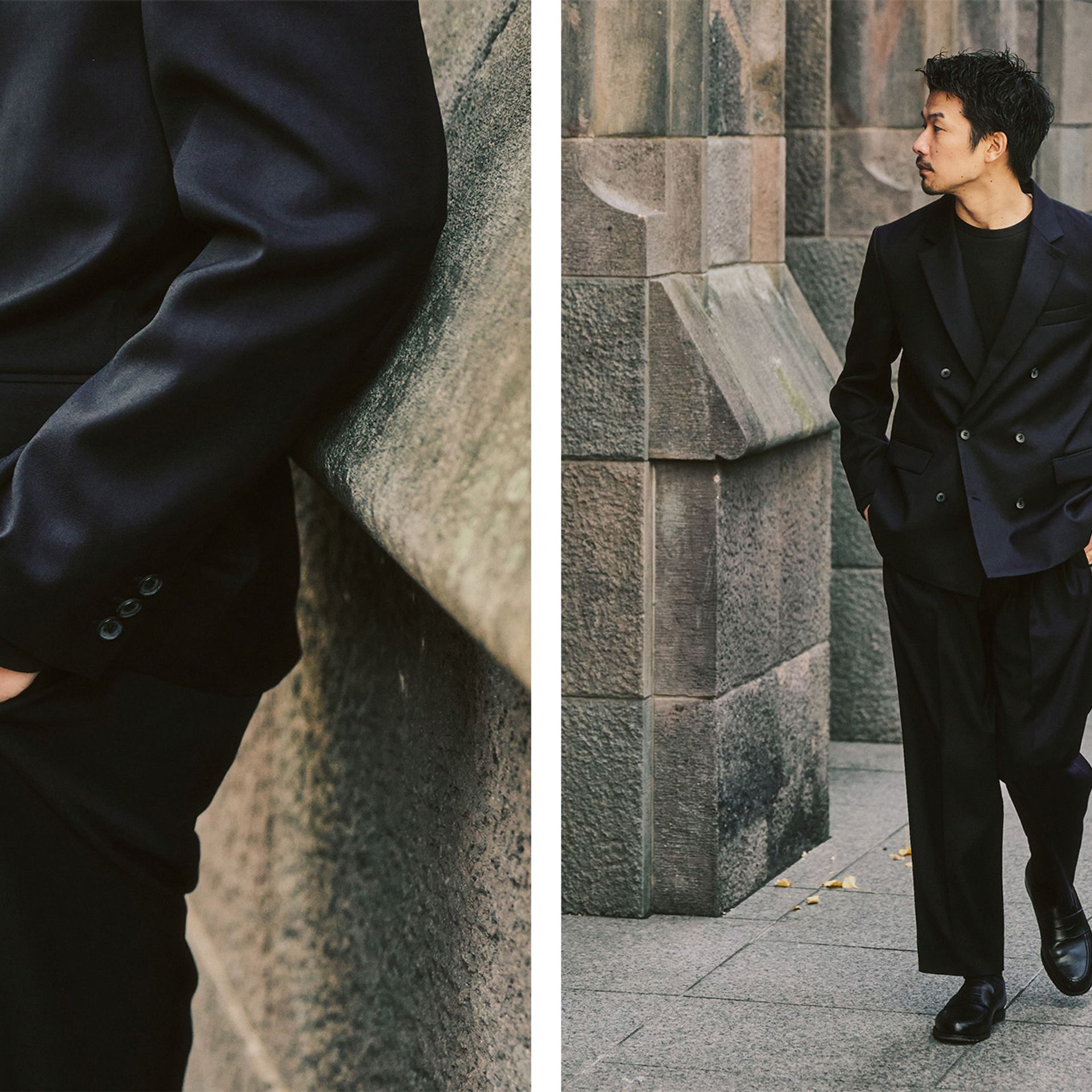 TWツイル素材の上品な表情と、シルエットバランスの良さによって、ダブル特有の主張をほどよく抑えています。ネクタイはしなくても、襟付きのシャツを合わせれば仕事で成立する。「ダブルでも、ビジネスシーンで使いたい」そんな方にフィットする一着です。