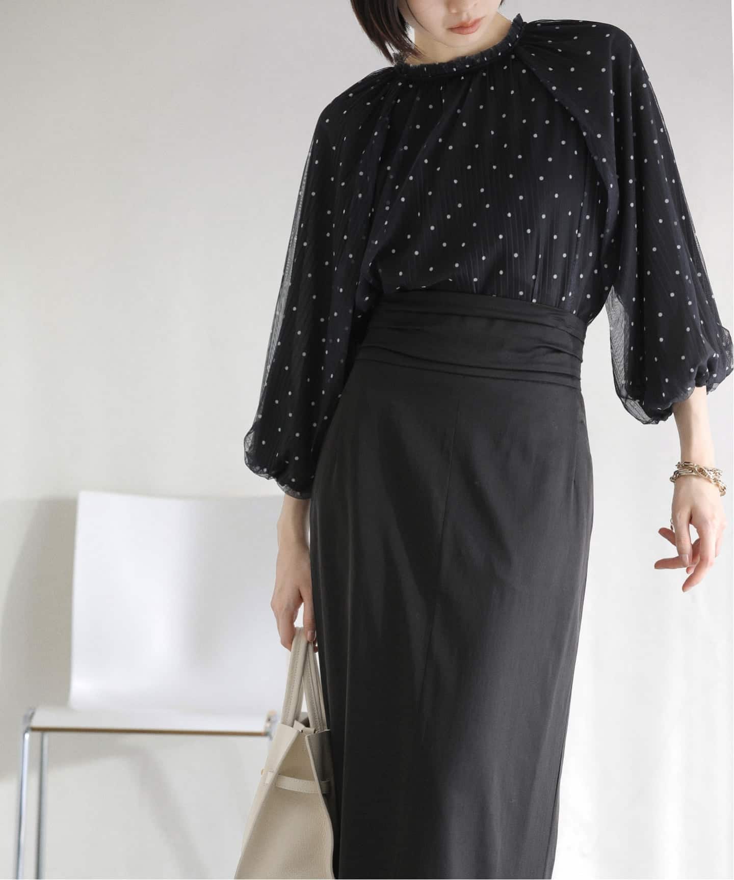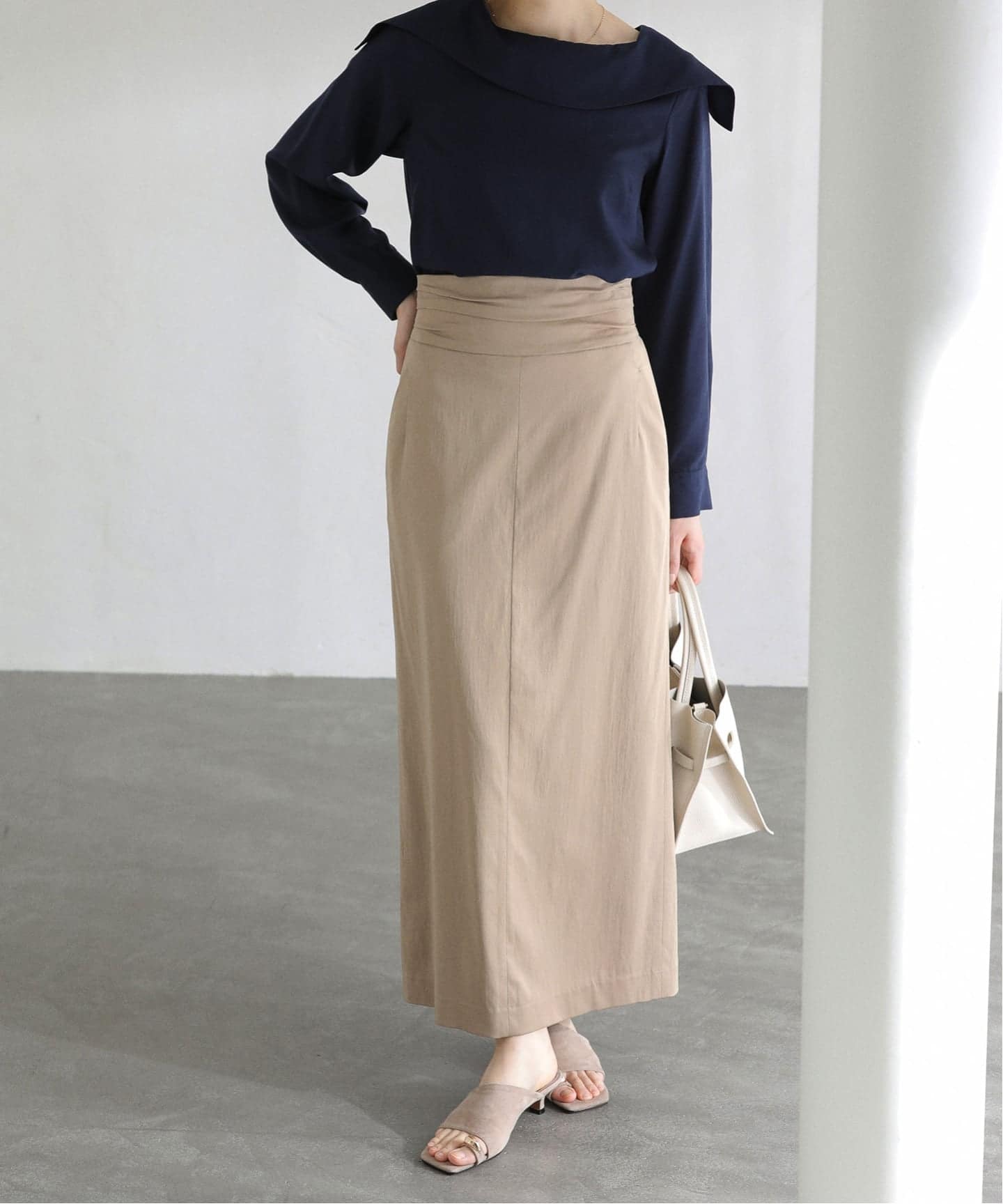 すっきりとしたシルエットが魅力のウエストタックタイトスカート。