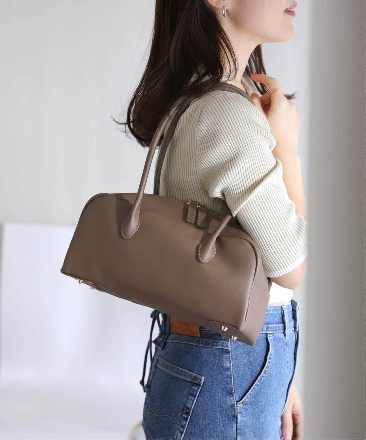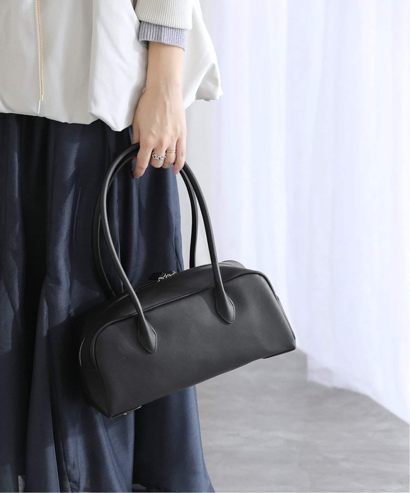 トレンドの横長シルエットのバッグ。