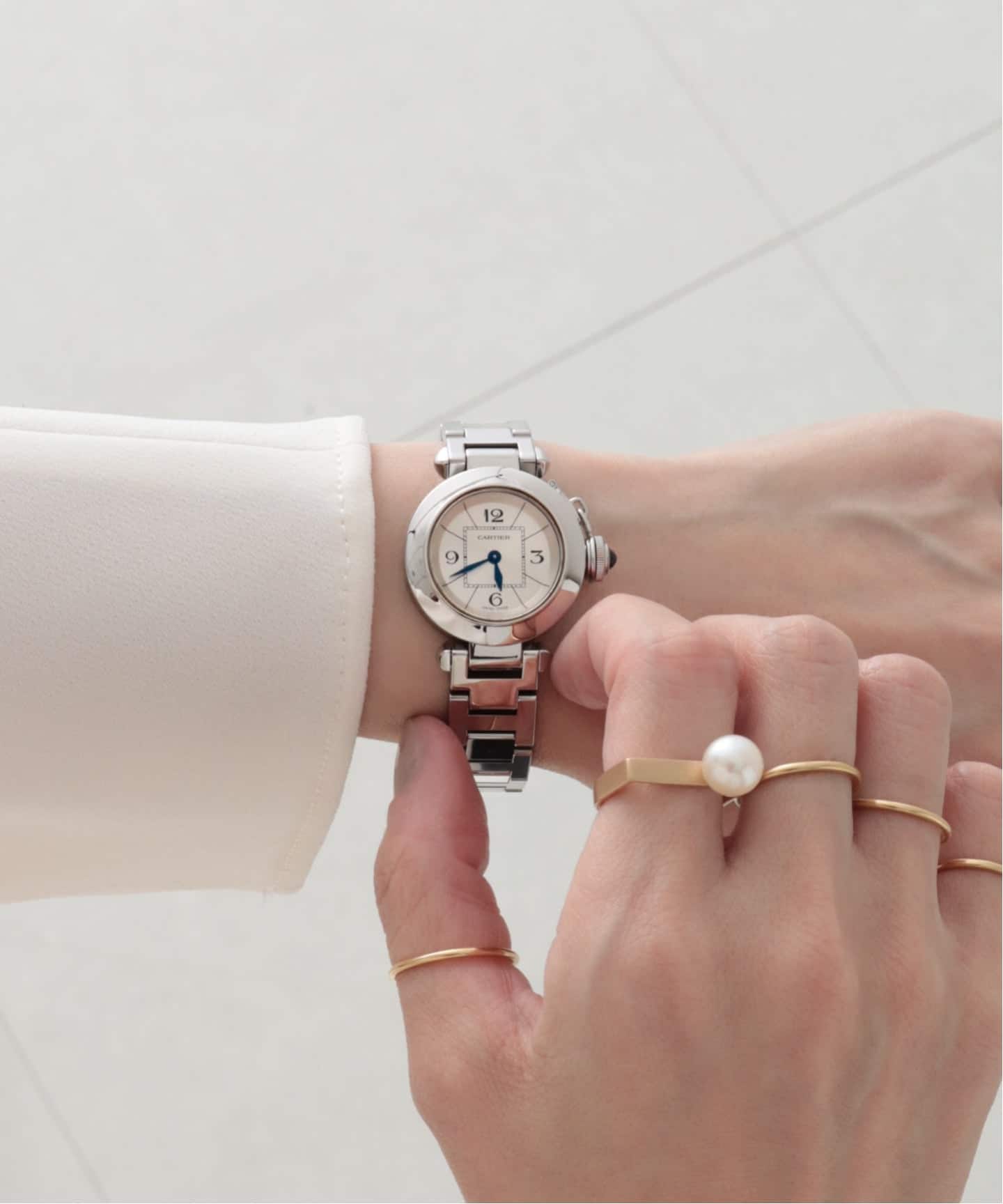 特別なバッグに合わせたいCartierウォッチ。数あるコレクションの中でもクリーンさの際立つシルバーカラーのブレスをチョイス。控えめなムードの中にある誠実な存在感はオケージョンシーンにぴったりとマッチ。