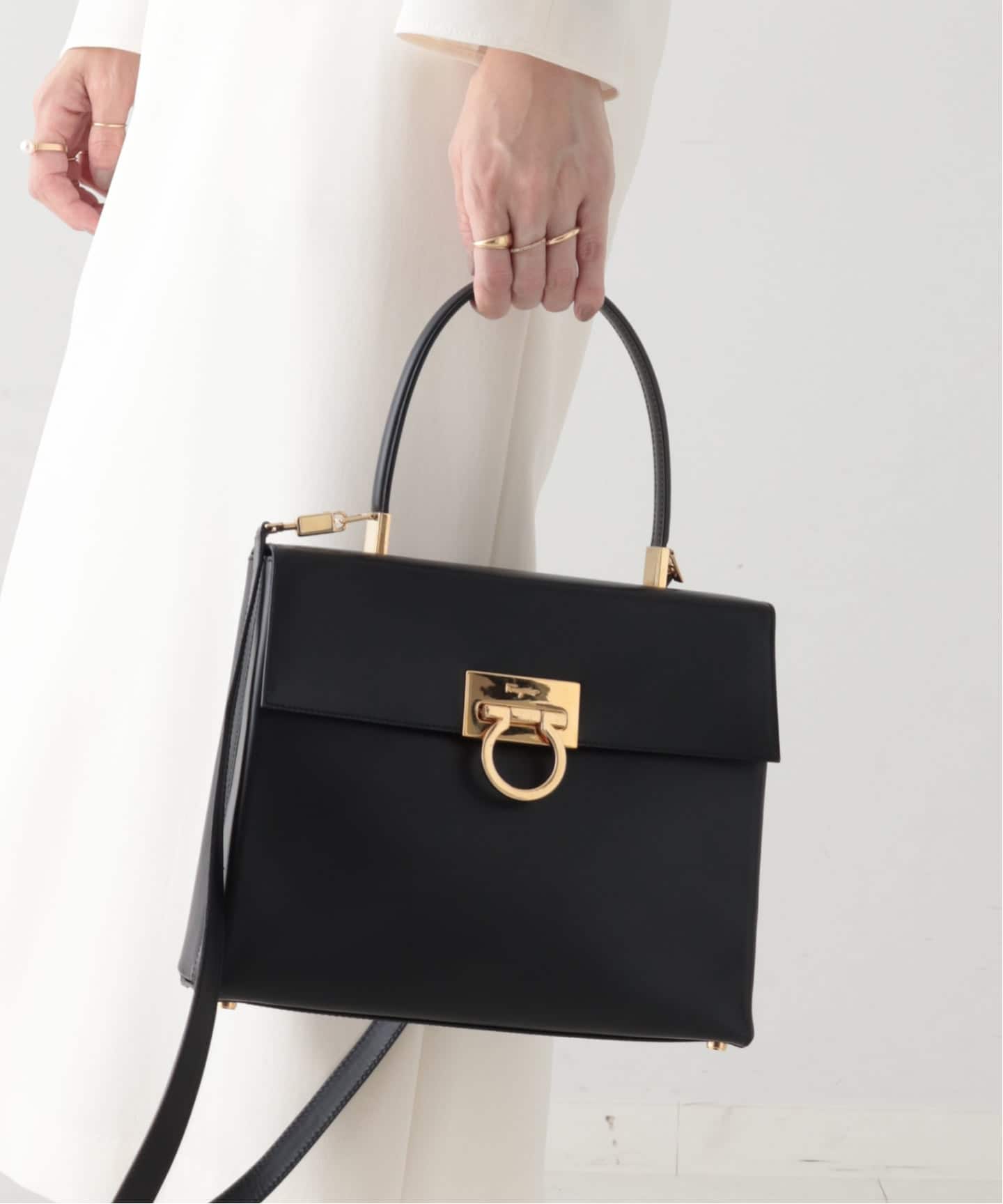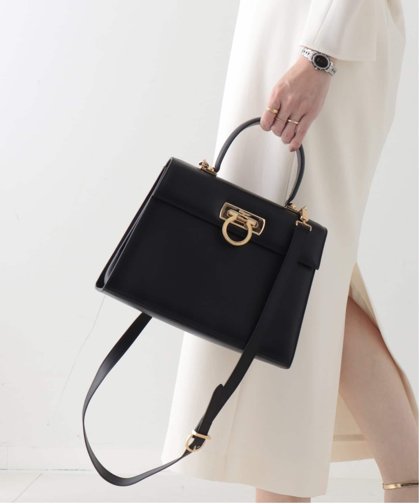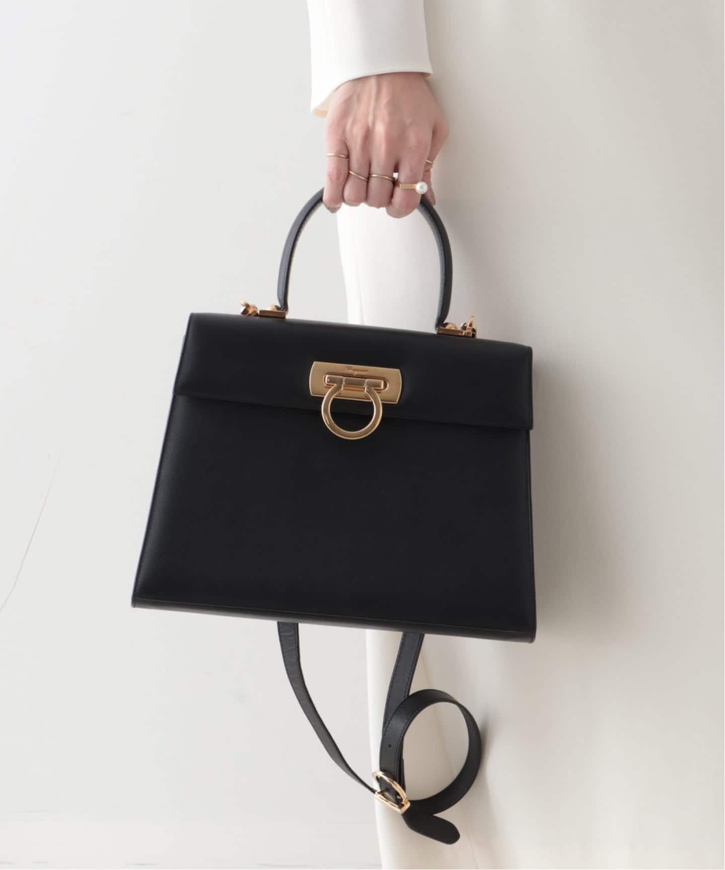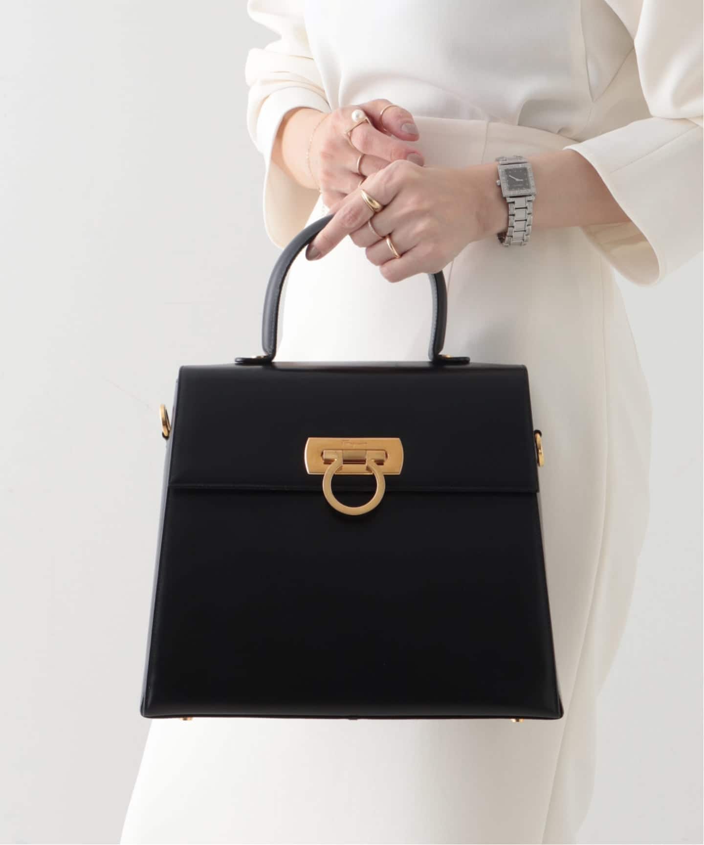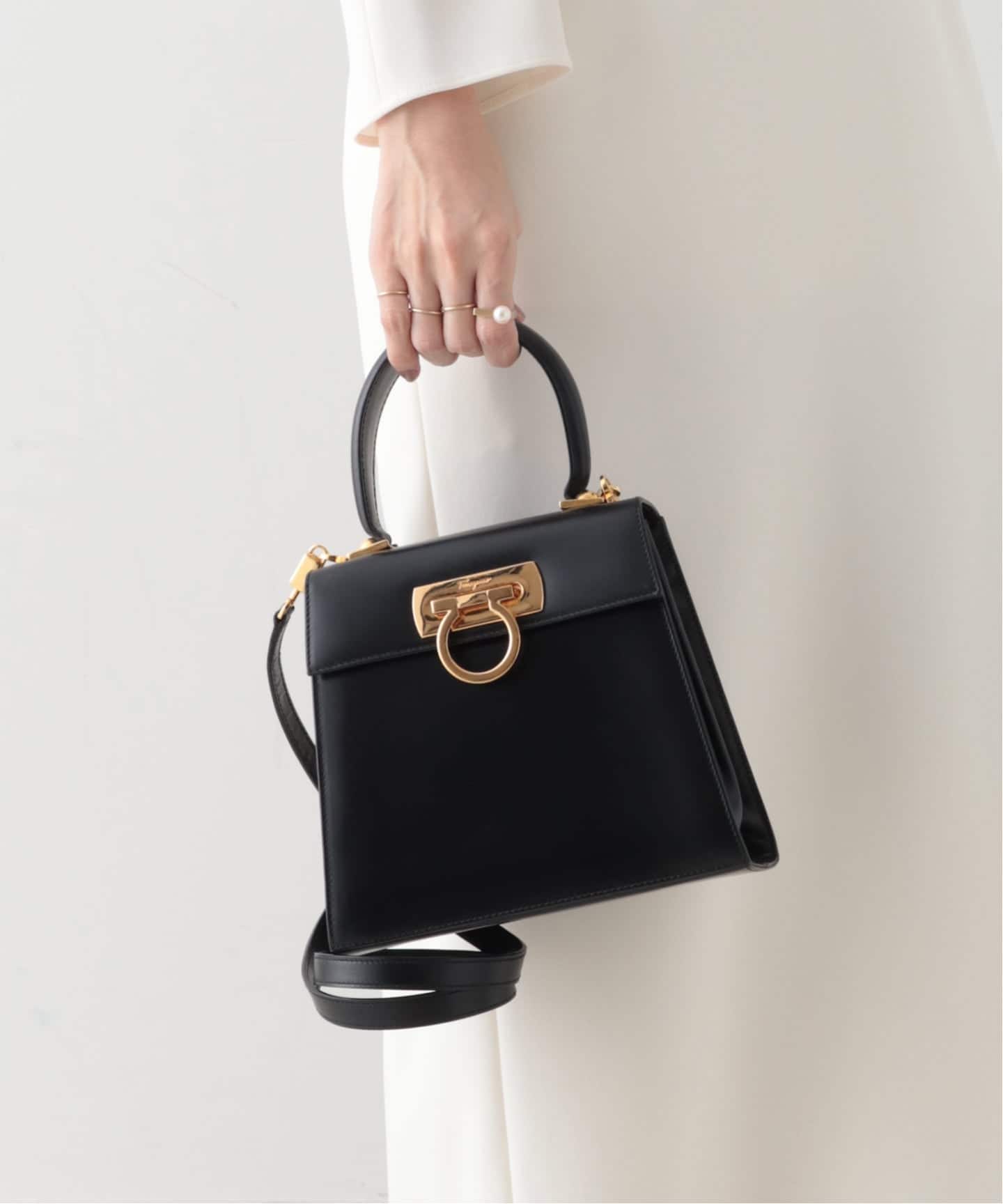 ブラックレザーにゴールドカラーのシグネチャー、ガンチーニが光るFERRAGAMOバッグ。エレガントなKEYとなるガンチーニがスタイルに程よい華やぎをプラス。重くなりがちなブラックレザーバッグのアクセントに。