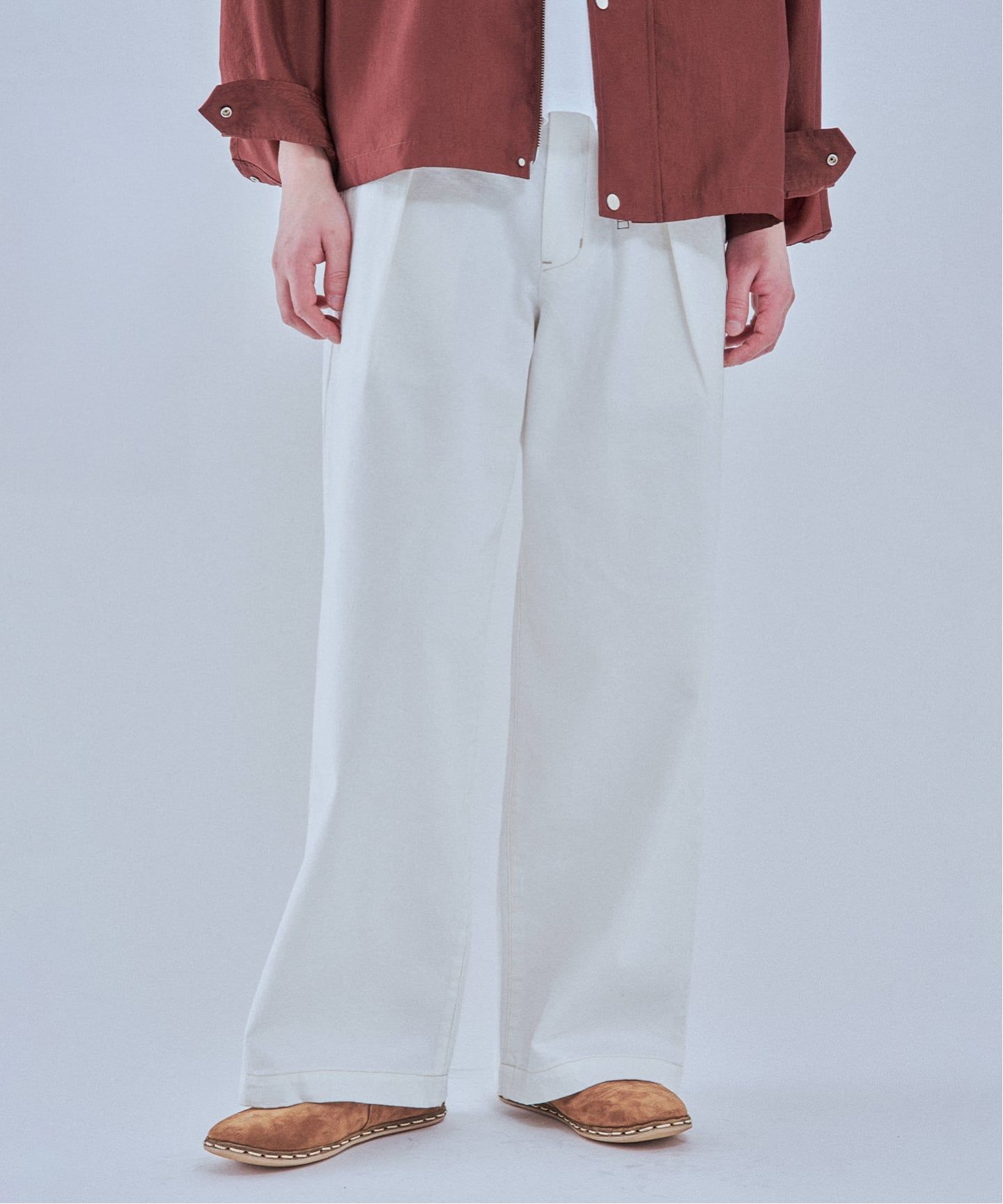 腰回りにタックを施し、自然な立体感とボリュームを演出。膝下にかけてすっと落ちるワイドシルエットで、ゆったり見えても全体はすっきり。