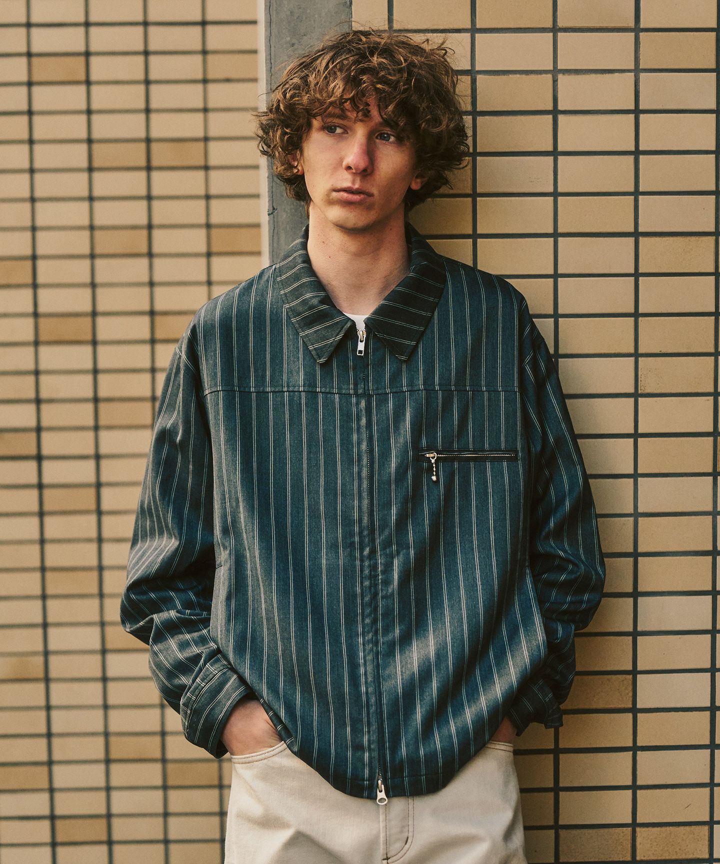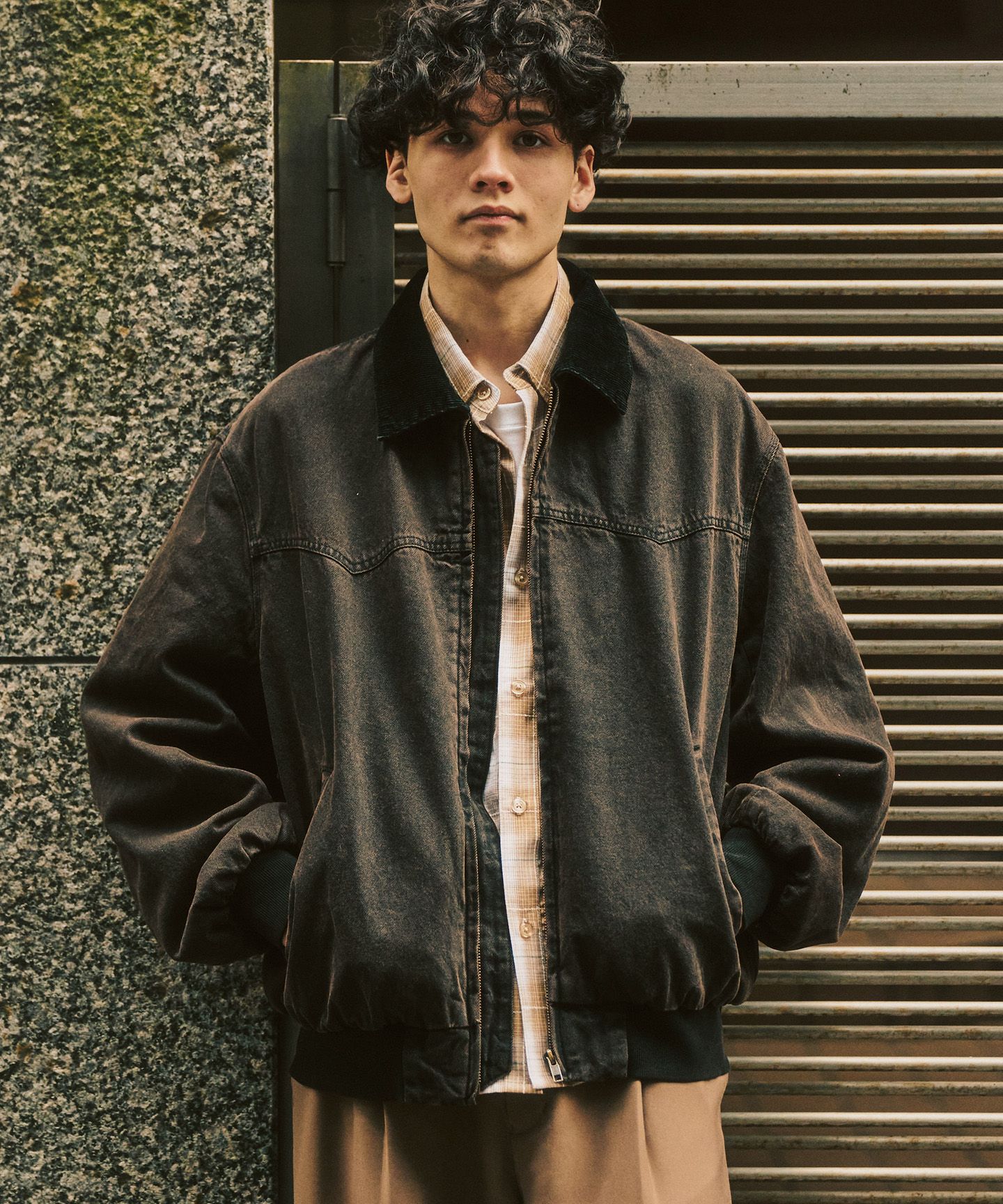一見するとベーシックなデニムジャケット。でも、よく見るとシルエットや切り替え、全体のボリューム感はかなり今っぽい。身幅にゆとりを持たせつつ、着丈は長すぎない。ジップ仕様にすることで、いわゆる“Gジャン感”から少し距離を取っています。