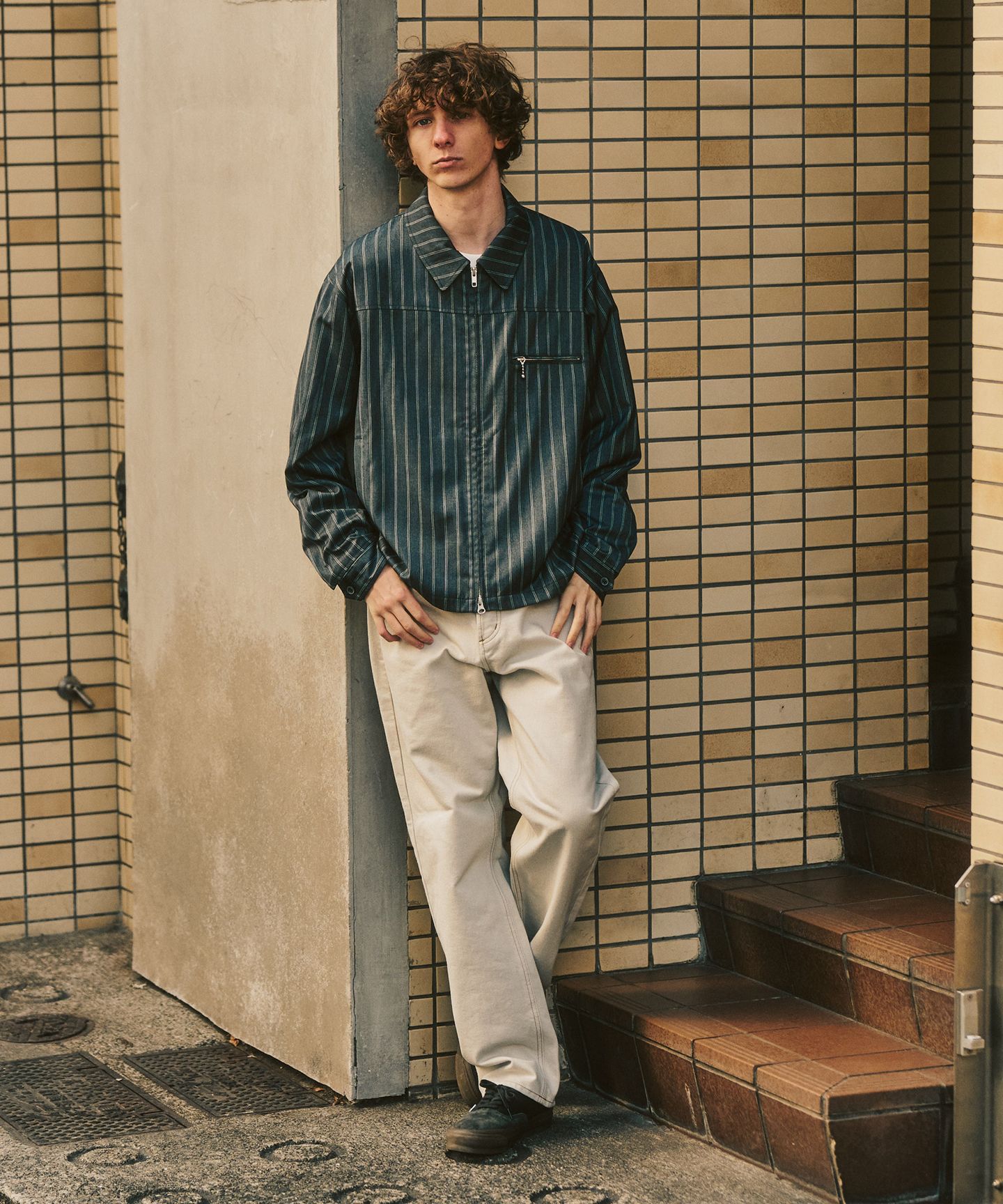 ストライプ柄も主張しすぎず、遠目では無地感覚、近くで見るとちゃんと表情がある。シャツ感覚で着られる軽さなのに、羽織るだけでスタイリングが引き締まるのがいいところ。