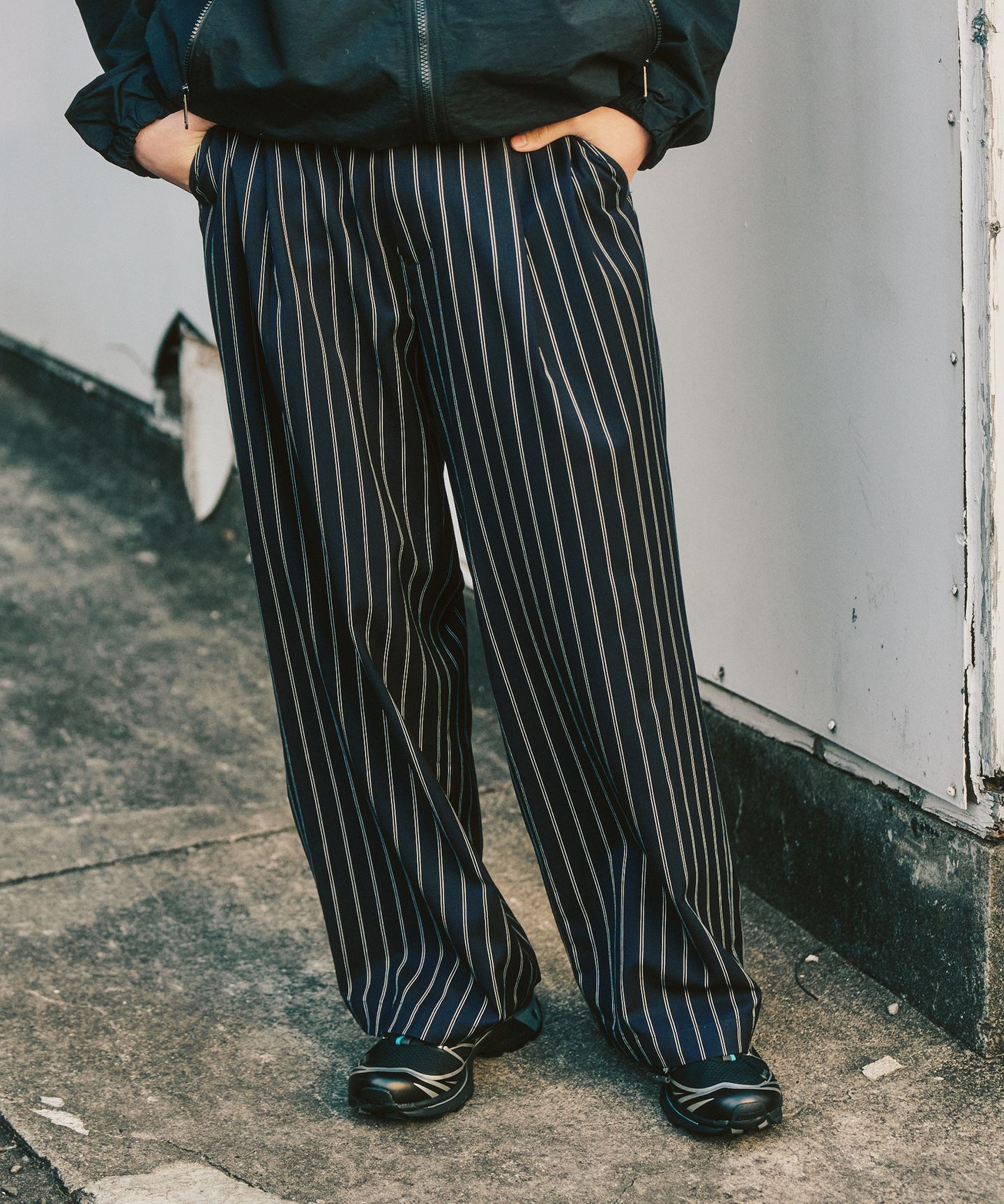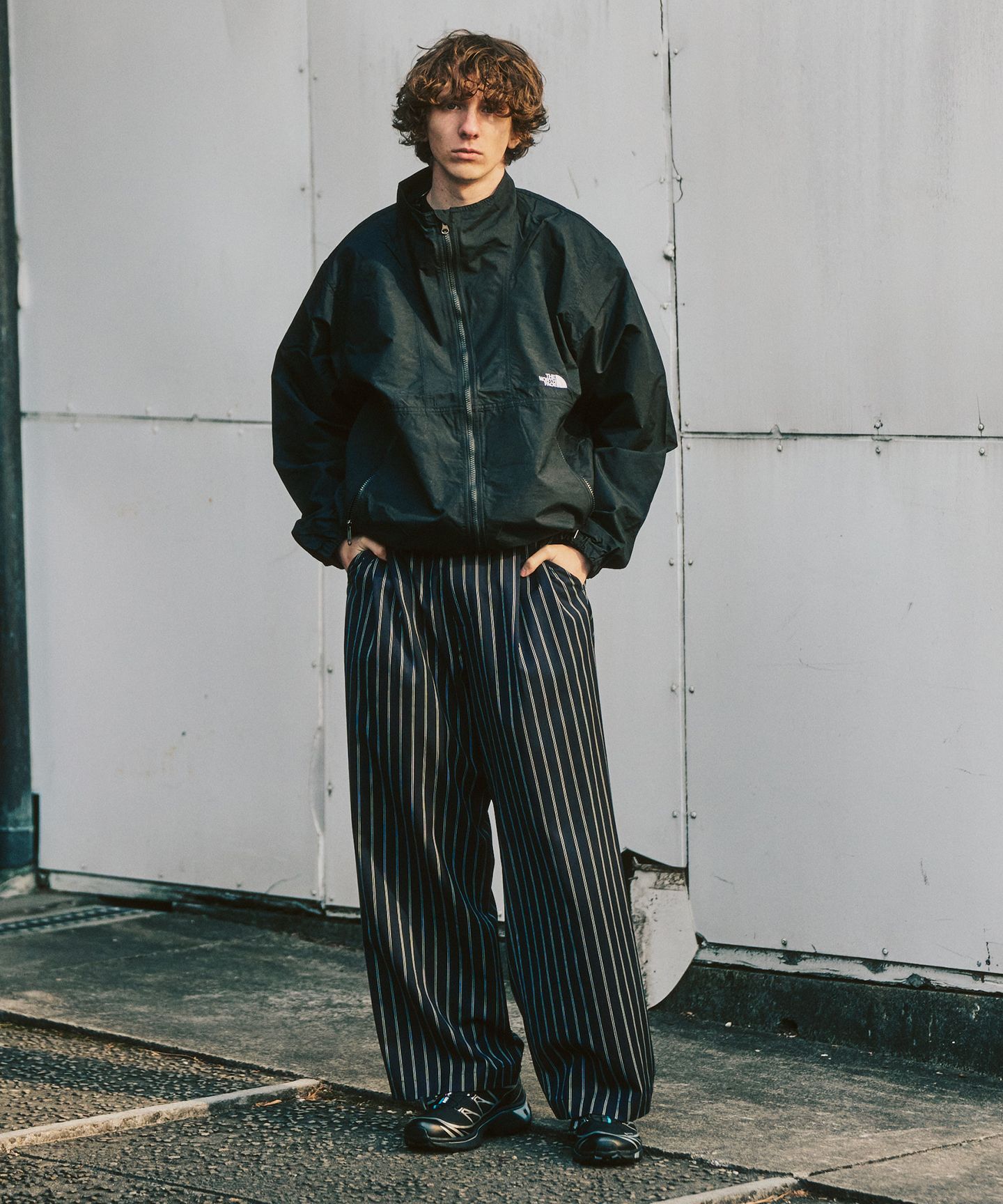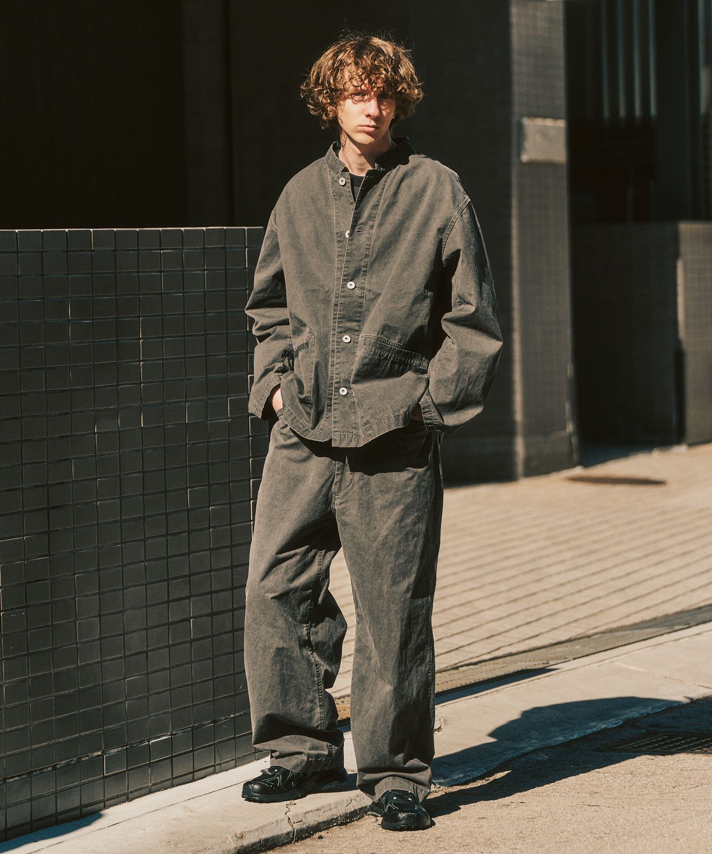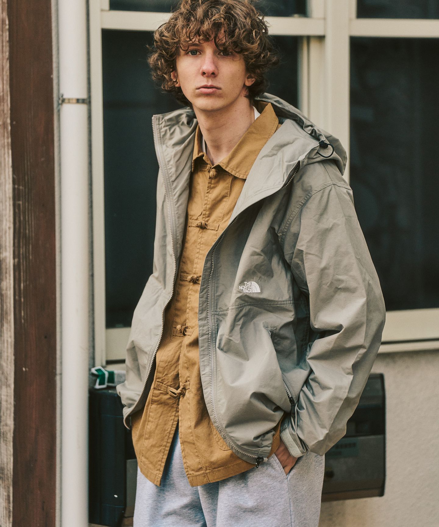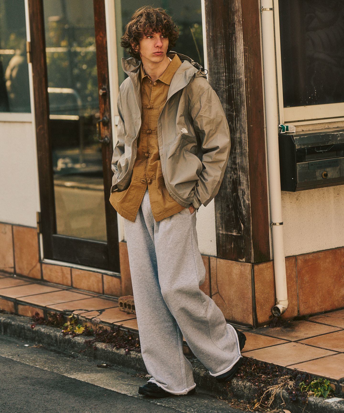 一見すると無駄のないシンプルな組み合わせ。でも、着てみるとしっかりと“理由”があることが分かります。動きを妨げない立体的なパンツに、首元をすっきり見せる別注のバンドカラーのジャケット。アウトドア由来の機能性をベースにしながら、街の景色に自然と溶け込むバランスに整えられています。