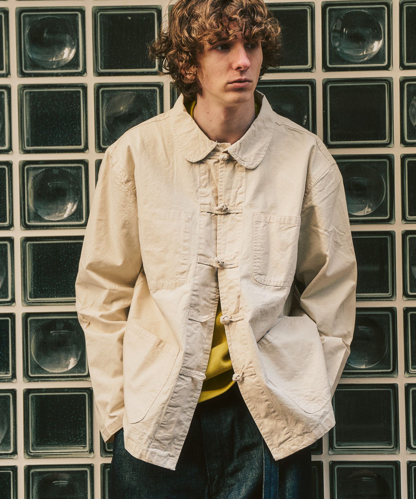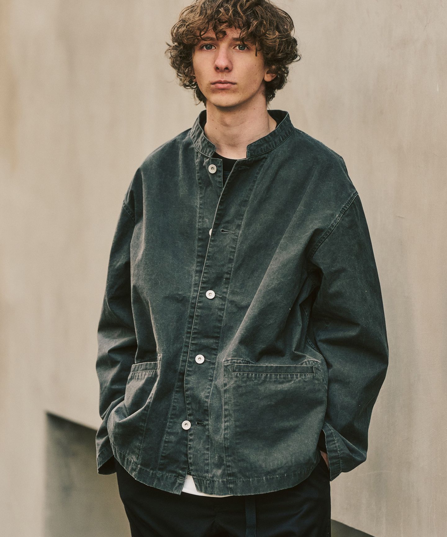 チャイナジャケット由来のディテールをベースにしながら、シルエットや素材感はあくまで軽やか。羽織るだけで雰囲気は出るけれど、主張しすぎないのが魅力です。ゆとりのあるシルエットと、程よく力の抜けた生地感で、構えず羽織れるのが魅力。