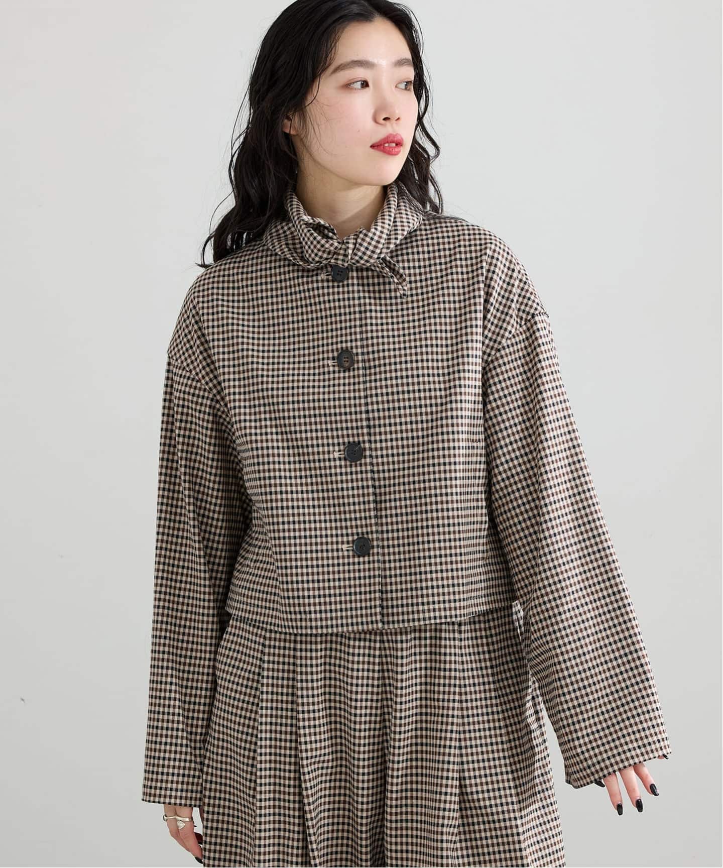 シェパードチェック柄のTR素材と、ワイヤー入りの大きな襟が印象的なデザインです。