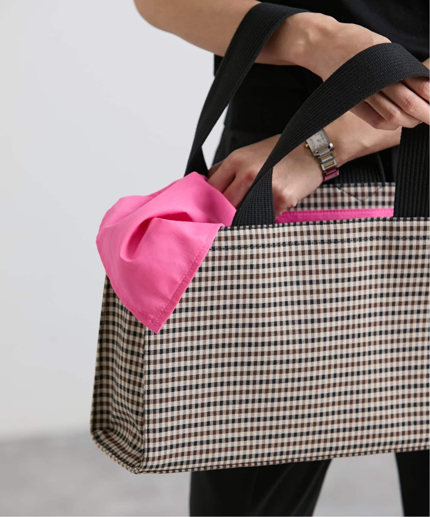 山本マナさんが選び抜いたシェパードチェック柄TR素材を使用した、モード感漂うトートバッグ。