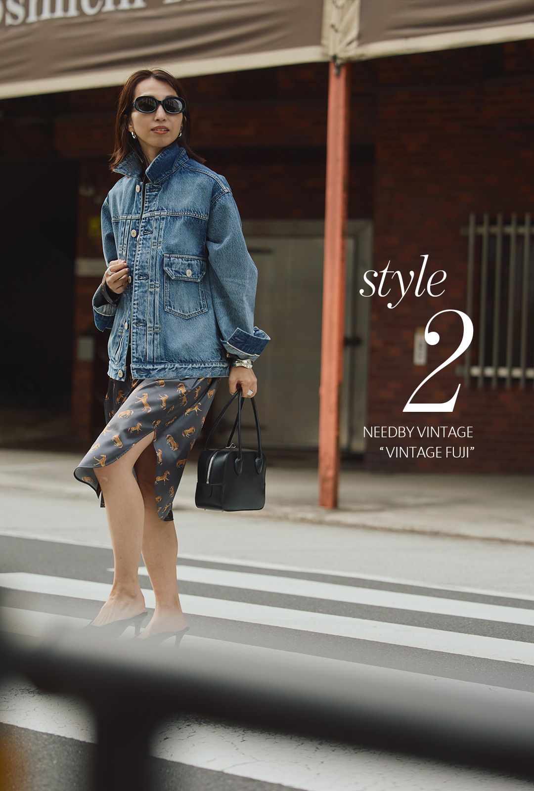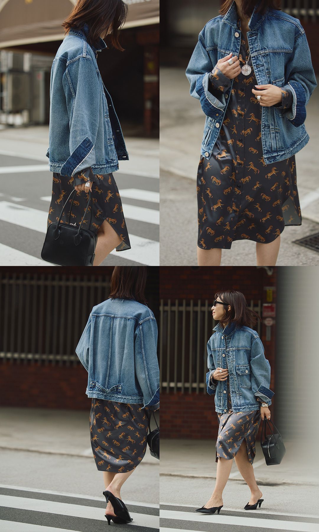 この春は印象的なワンピースにもさらっと羽織って。大胆な柄もデニムとミックスするとスタイルになじみます。