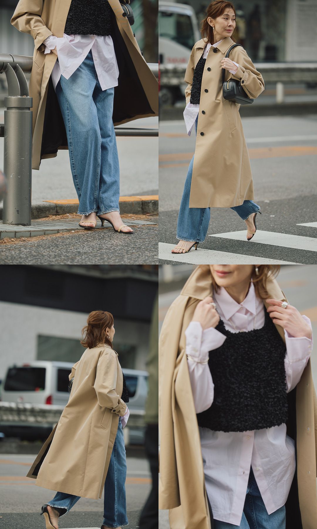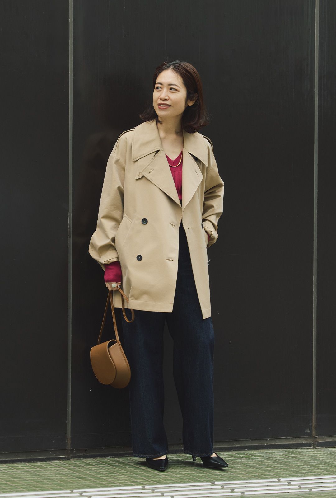 シックで今の気分が決まるショートトレンチにばさっと羽織ってモードにまとめて。