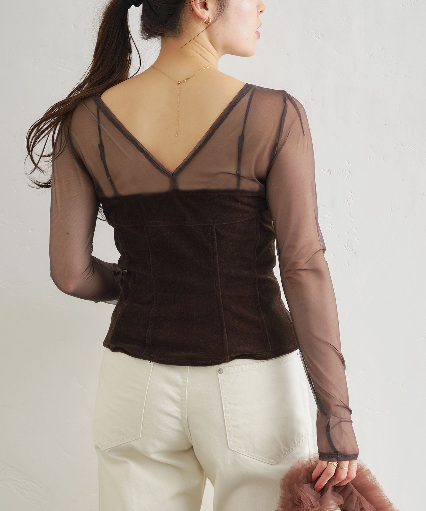 シアー素材の程よい透け感がデコルテを美しく引き立て、ベロアの柔らかな光沢が立体感をプラス。