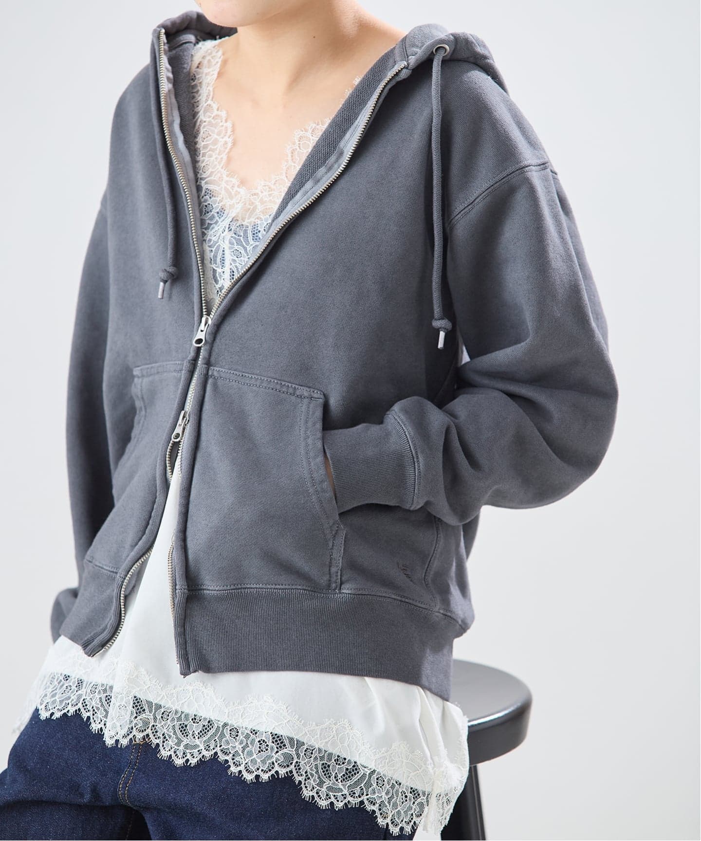 ピグメント加工の色落ちの風合いや、ダブルジップで大人の抜け感を演出しスカートやパンツとの相性も抜群です。デイリーから休日のお出かけまで、幅広く活躍する一枚。