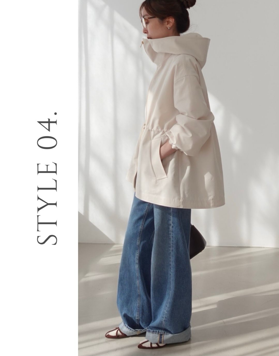 4スタイリング目は、名品素材ハイツイストダブルクロス素材を使用した、フーディーブルゾン。ウエストについているドローコードで着こなしのバランスを調整できるのが嬉しい。デニムと合わせても綺麗めにまとまるので、毎日の着こなしにさっと合わせて洒落見え間違いなしです。