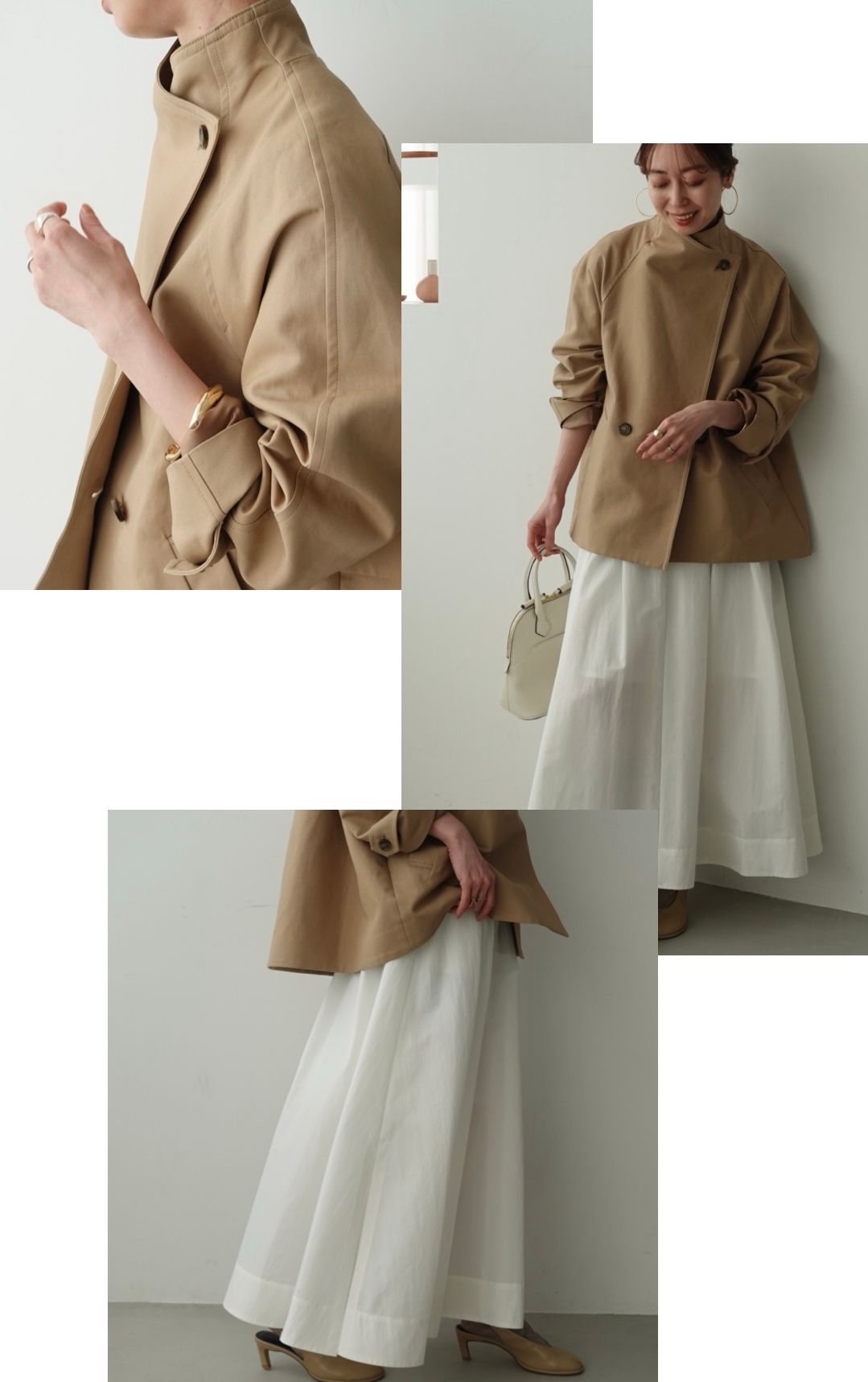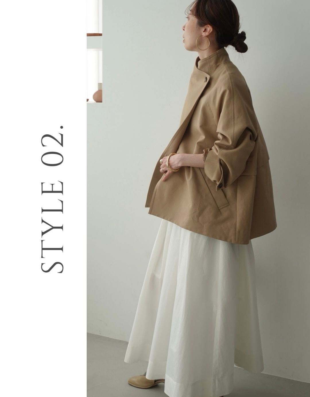 2スタイリング目は、昨年も大変ご好評いただきましたコットンダブルクロス素材を使用したコート。今年は、ヴィンテージ加工をつけてより柔らかい仕上がりに。ボタンをとめるとハイネック風に着こなせるのが嬉しいポイント。あえてトップス風に着こなして、大胆なボリュームスカートで合わせるのて少しモードな印象に。ベージュと、クリーンなホワイトのバランスが春のムードを高めてくれます。
