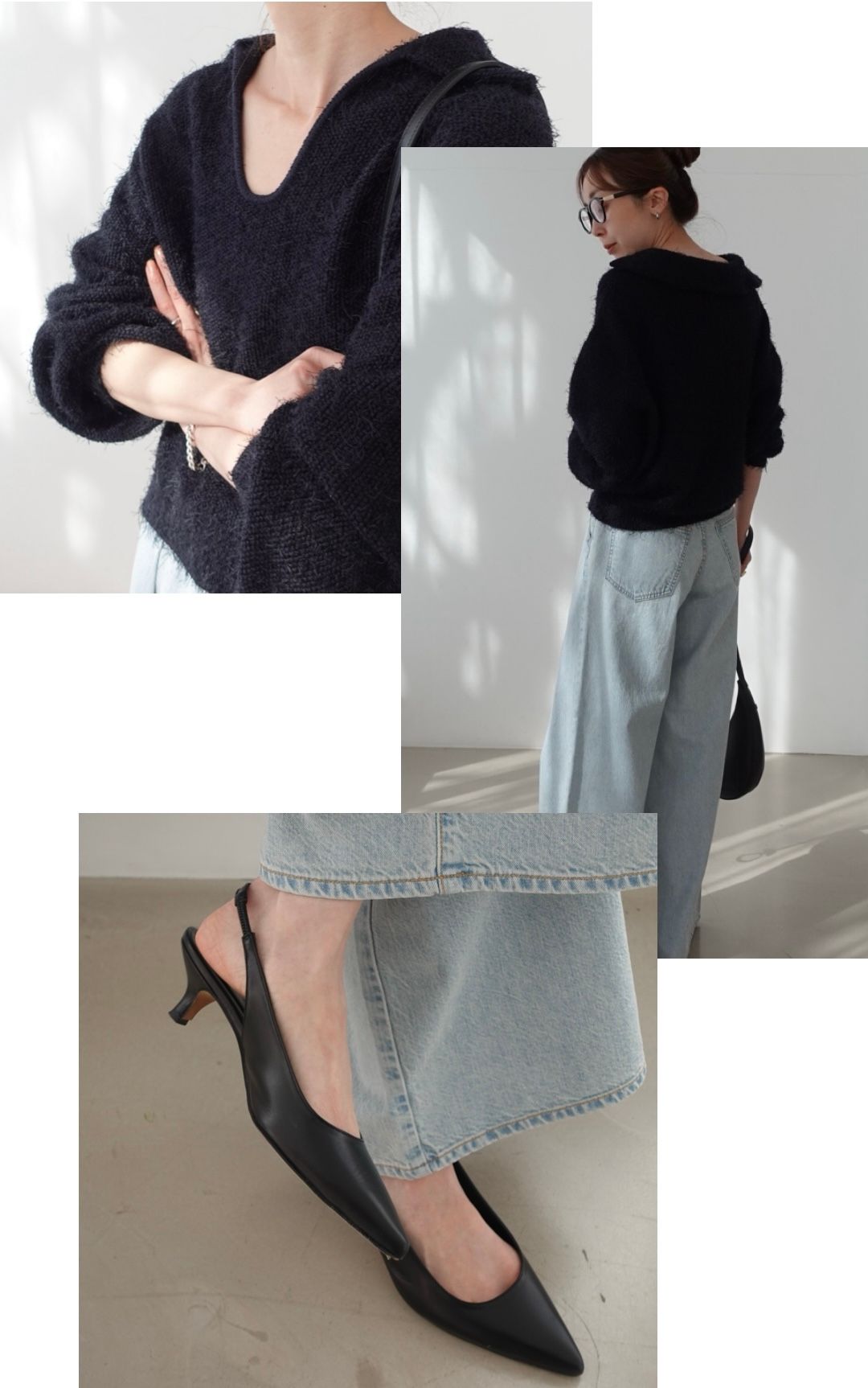 6スタイリング目は、注目のスキッパーニット。ふわっとしたフェザー素材と、スタイリッシュなフェザーのバランスが、着るだけで今年のムードを盛り上げてくれる一着。デニムで合わせて、カジュアルな印象に。足元やグッズでスタイリュシュにまとめたのがポイントです。