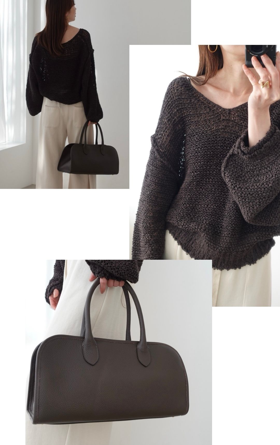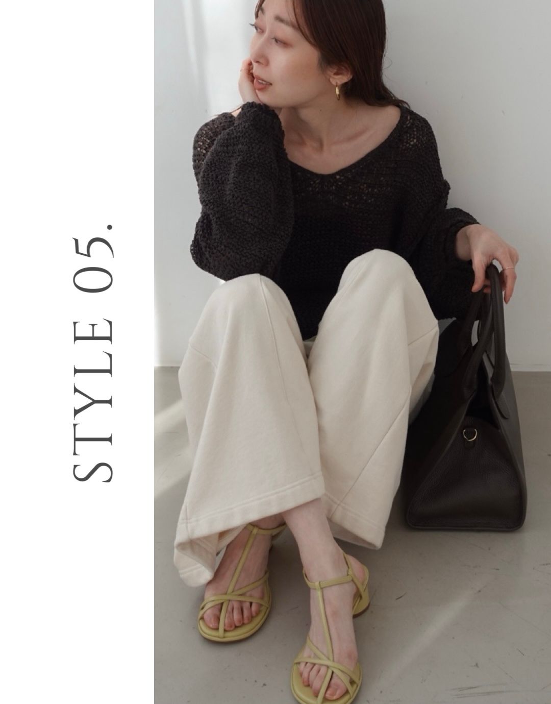 5スタイリング目は、一押しニットを主役にした、リラックス感ある着こなし。オーバーすぎないざっくり編みのニットは着るだけでこなれ感が生まれるデザイン。高級感のある糸を使用しているので、あえてボトムスにワイドスウェットパンツを合わせた着こなしもおすすめです。