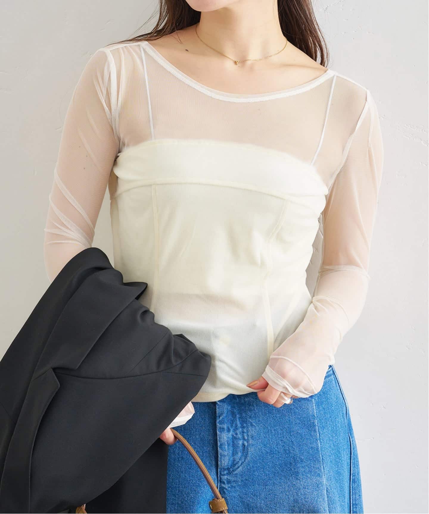 シアー素材の程よい透け感がデコルテを美しく引き立て、ベロアの柔らかな光沢が立体感をプラス。