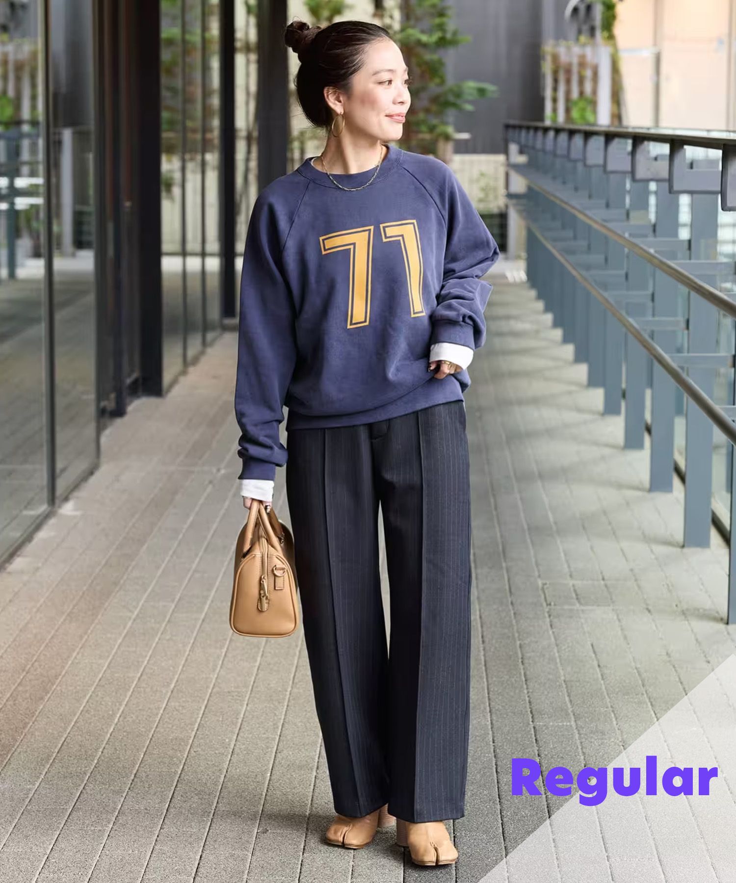 スウェットやニットなどカジュアルトップスとメリハリのあるコーデの完成。