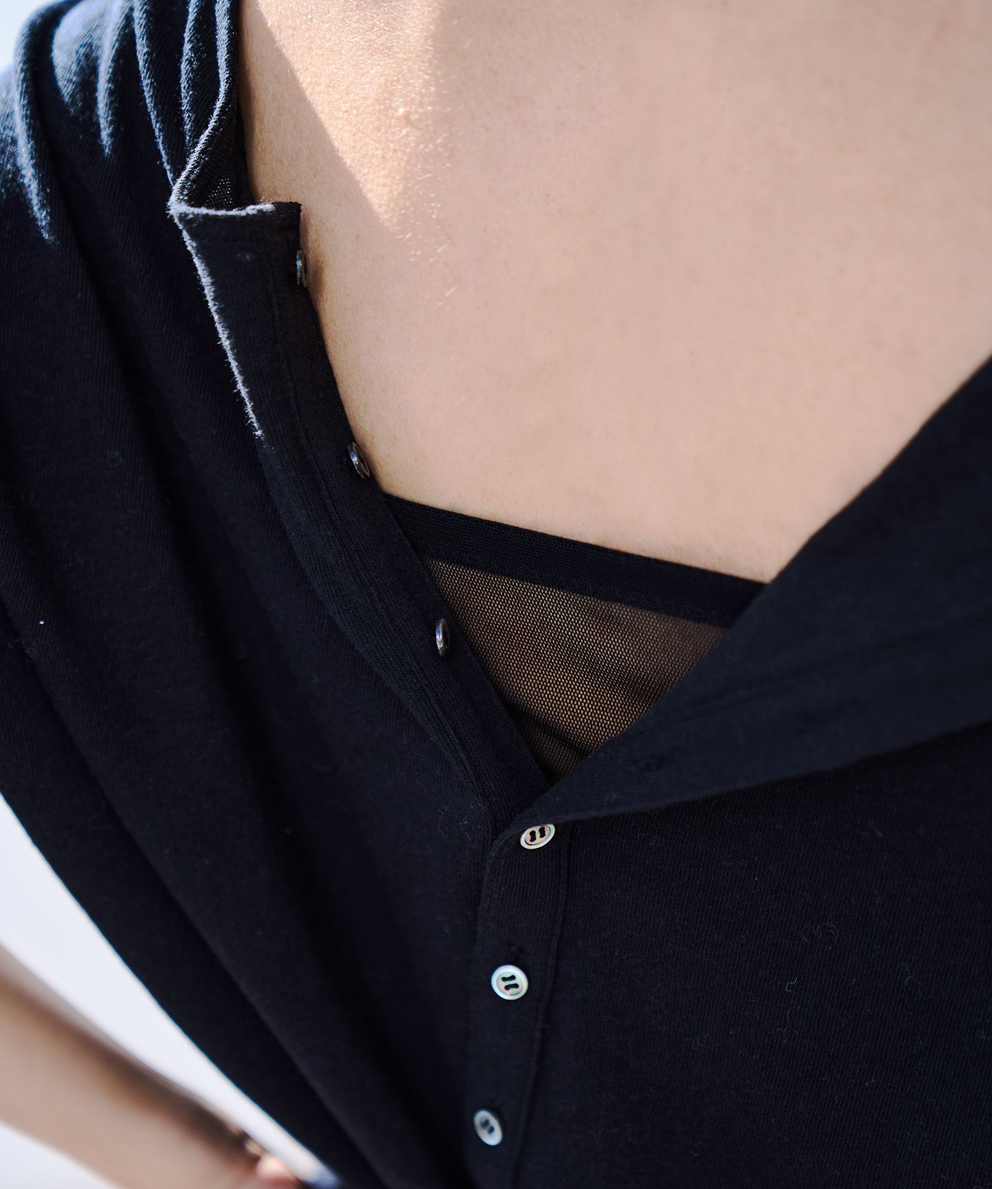 背中が開いたデザインのトップスには、あえてメッシュをのぞかせて、さりげない抜け感を楽しんで。