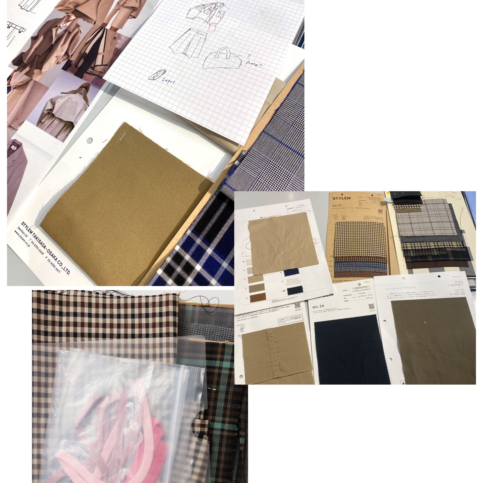 マナさんのインスピレーションとIENAデザイナーの提案を何度も重ねて、素材やデザインが決まっていきます。 最初の“トレンチコート”のキーワードのまま、素材はチノ風のベージュ生地、そしてチェック柄も。それらを今年らしいトラッドなアイテムにすることになりました。
