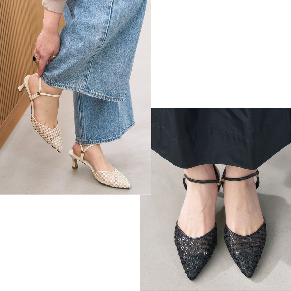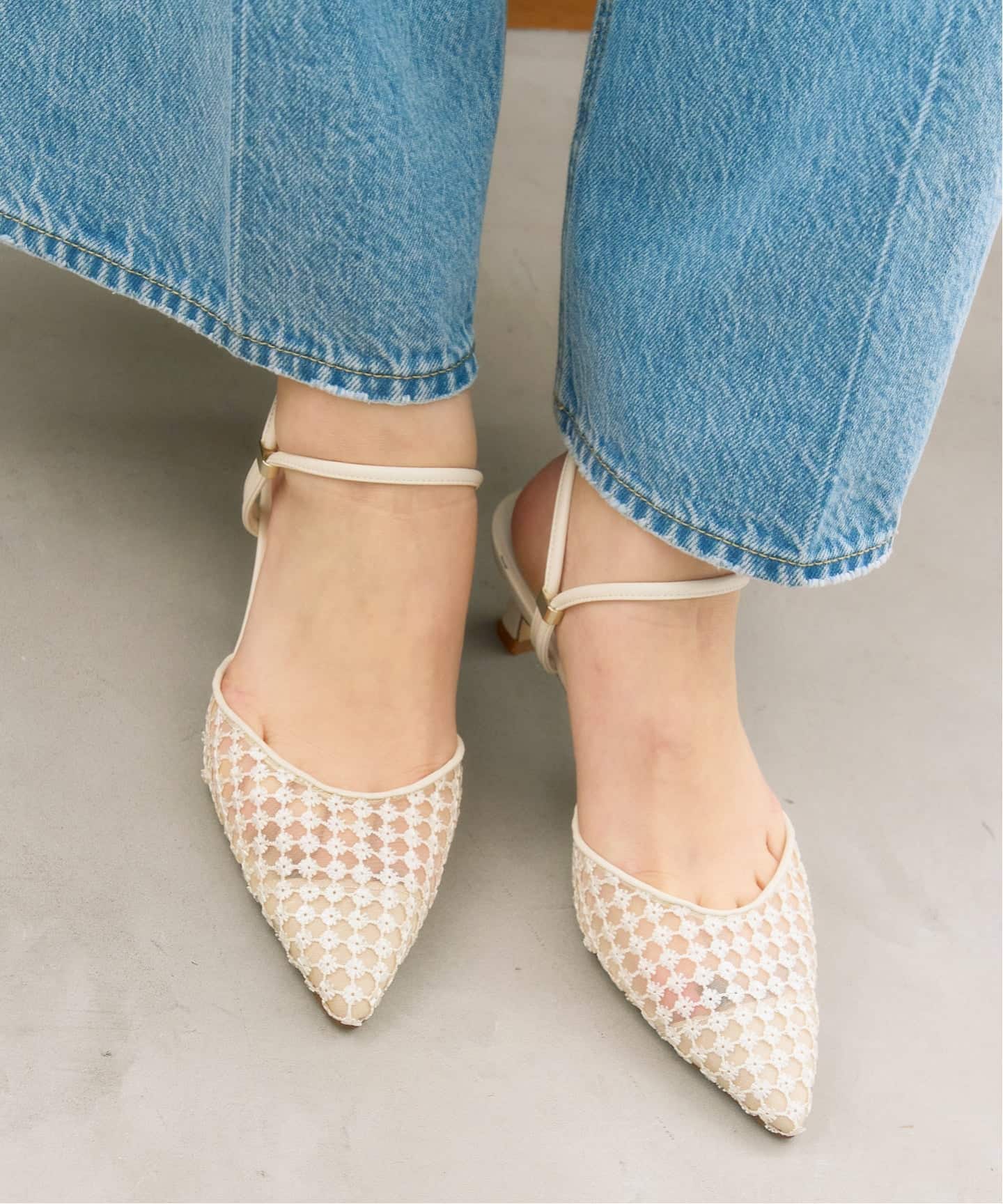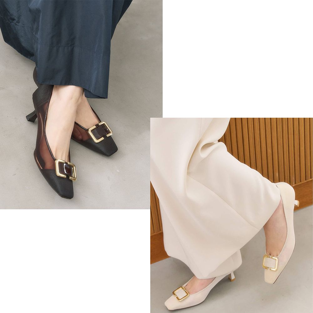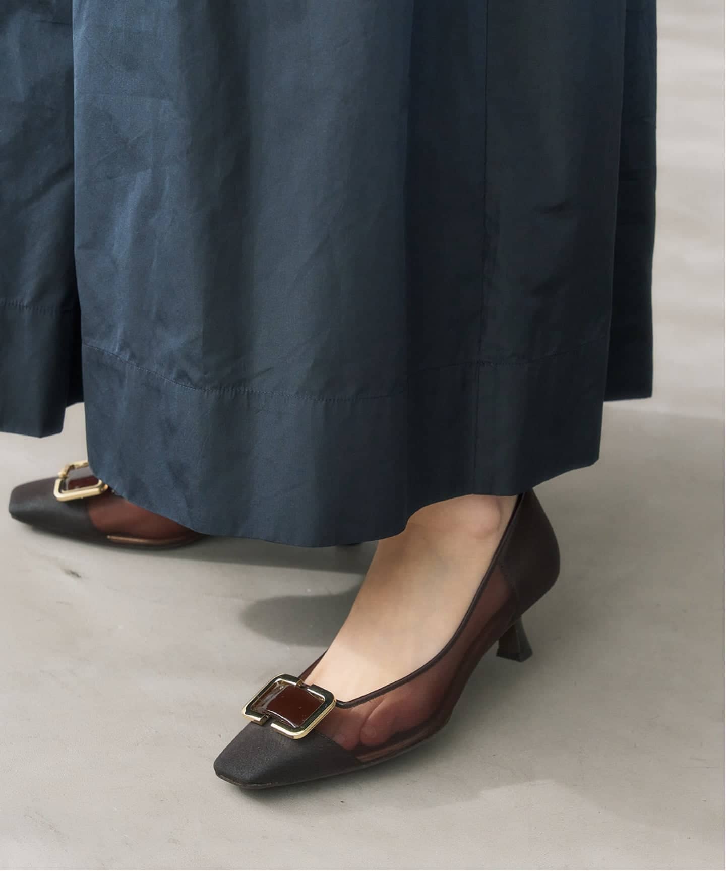 透けすぎず上品な印象で履いていただけて、オケージョンにもおすすめのパンプス。ポイントのバックルはオリジナルで作成しており、強く見え過ぎないようこだわりのデザイン♩