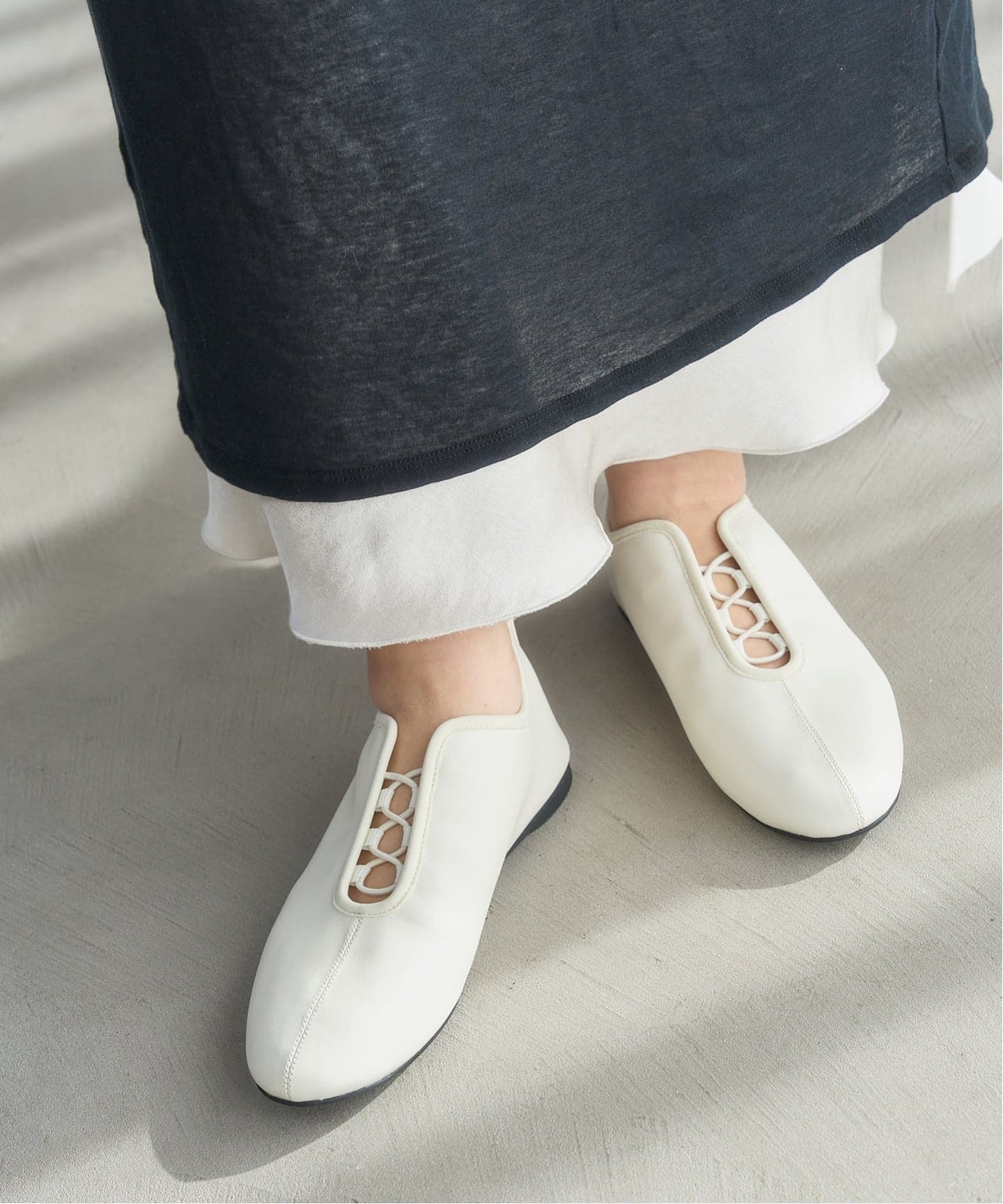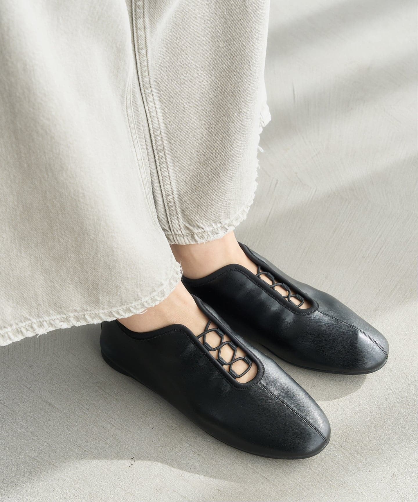 すっきりと細身のデザインと甲部分のスリットで抜け感のあるモードな雰囲気に仕上げたフラットシューズ。バレエシューズ以上スニーカー未満の新鮮な足元のバランスを楽しめる1足です♩