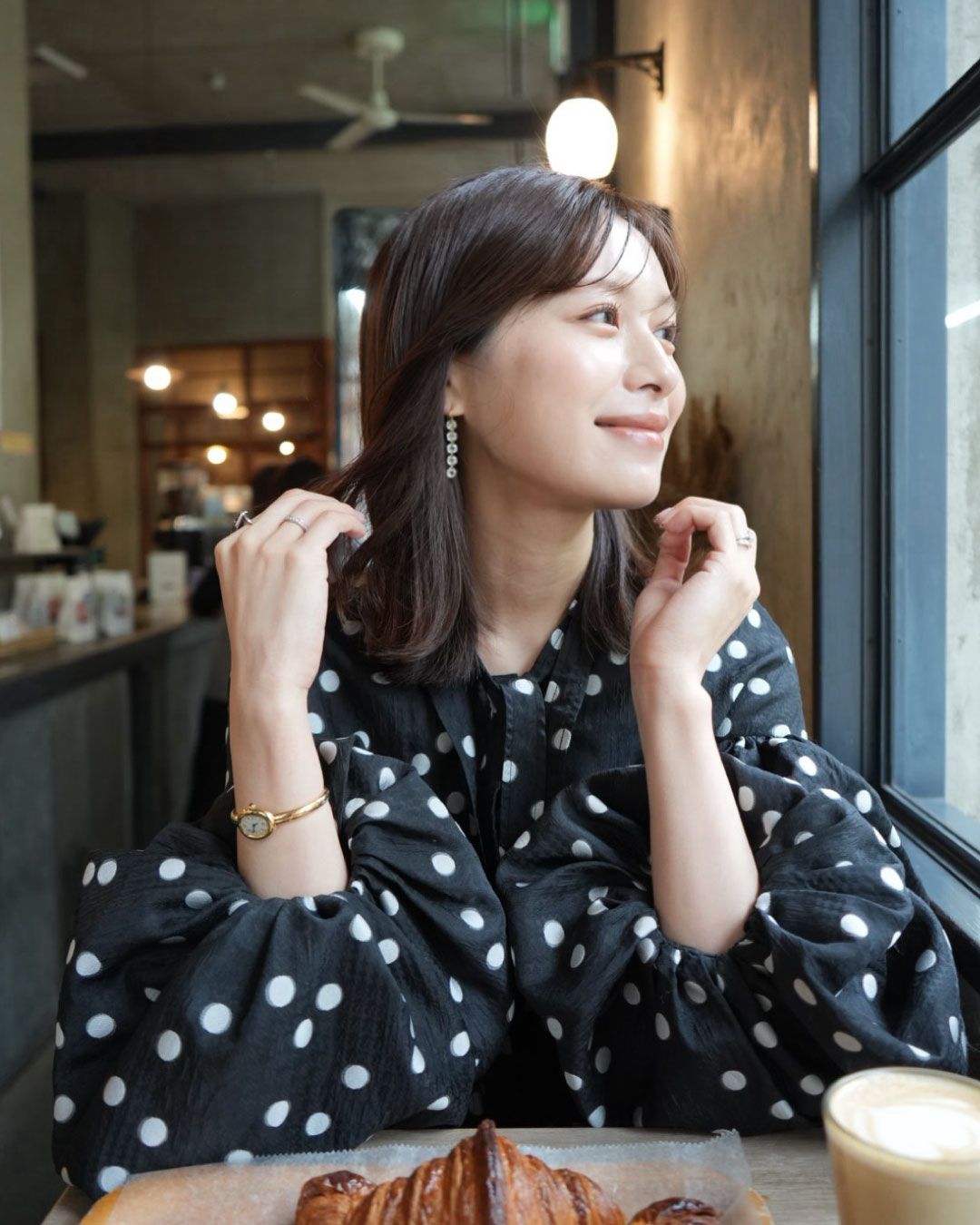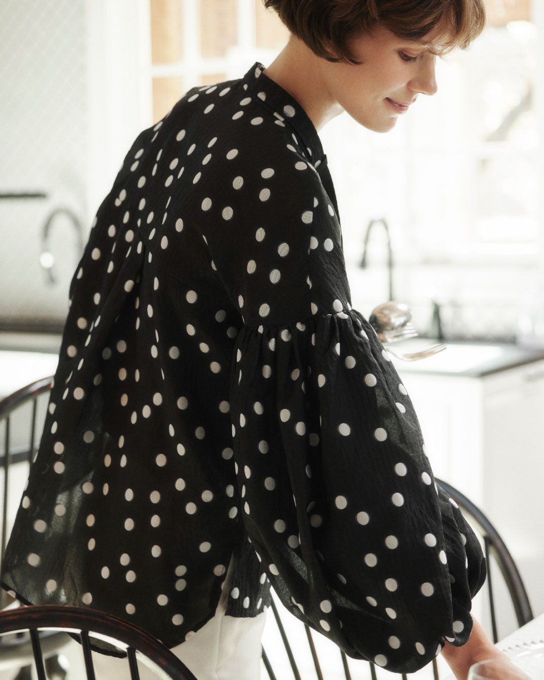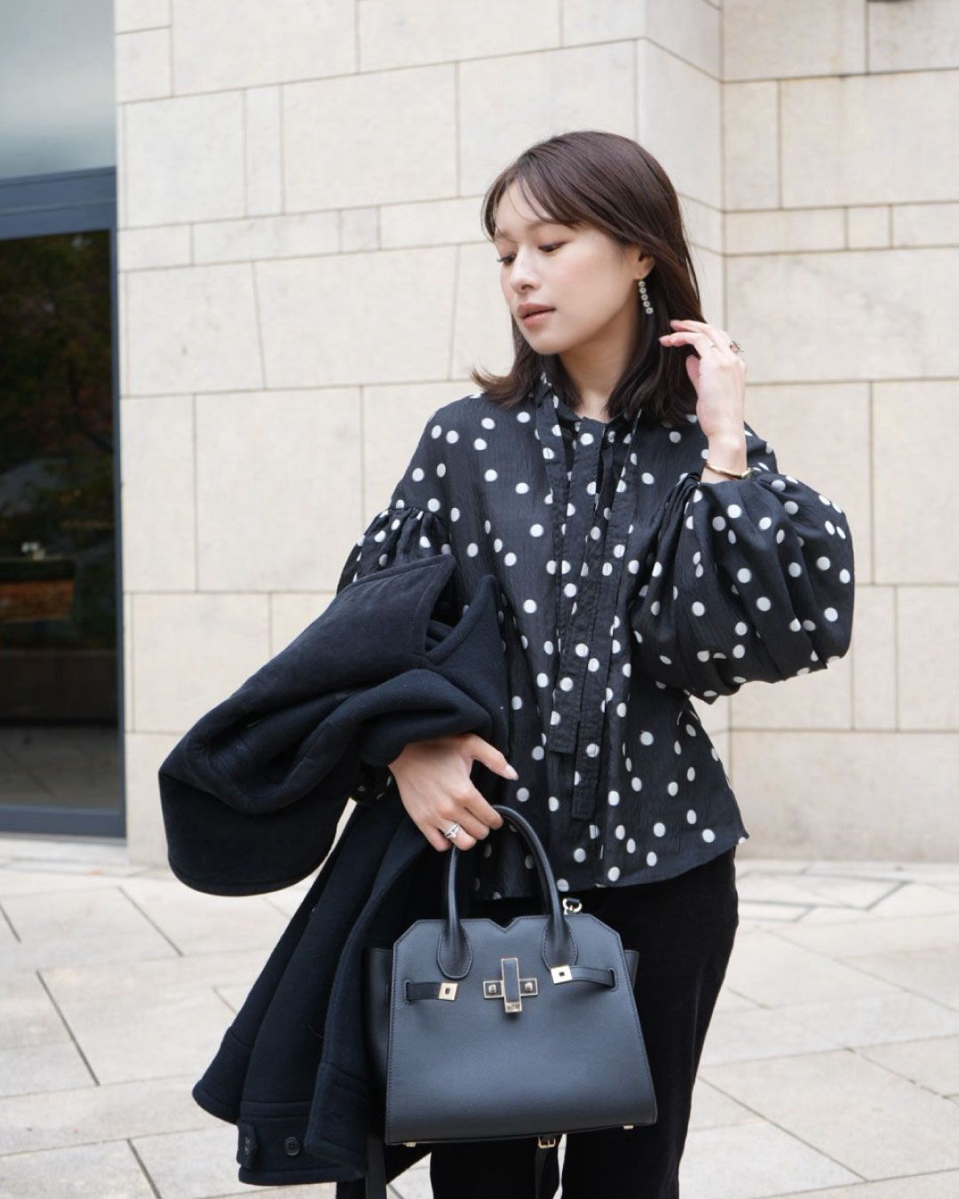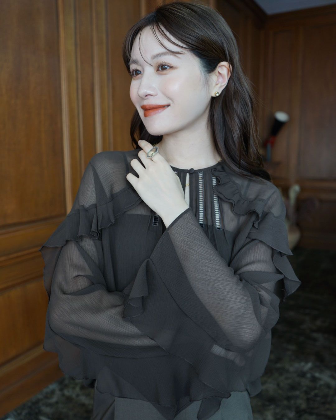 ドット刺繍が施されたシボ感のあるシアーなジャガード生地が、奥行きのある表情と品のある存在感を引き立ててくれる人気のブラウス。