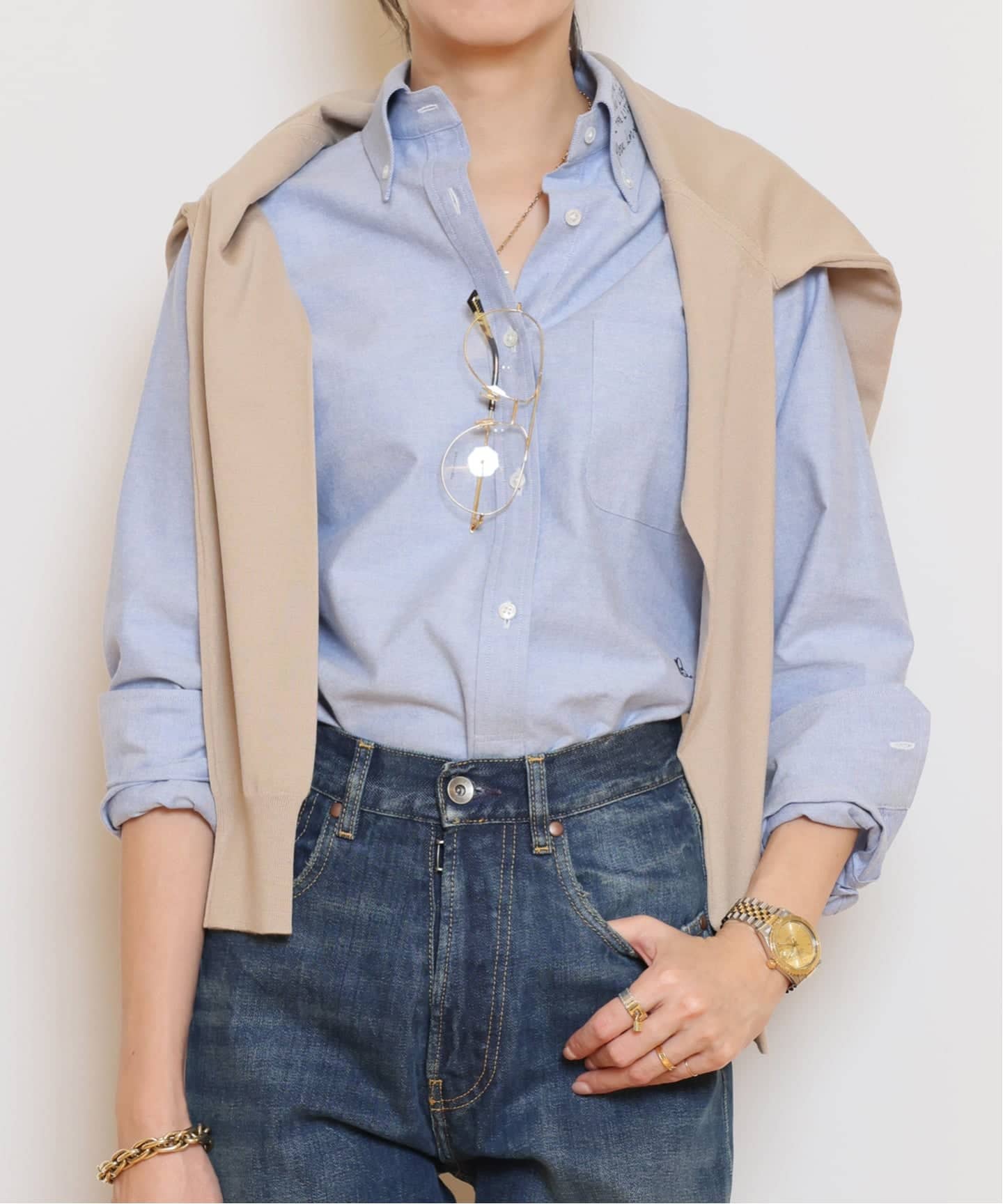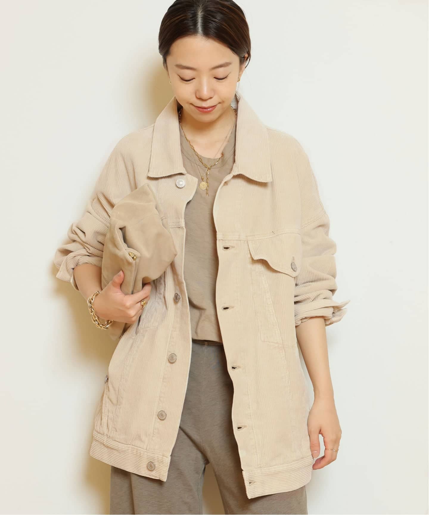 ヒップまで覆う着丈と、体が泳ぐサイズ感が、自然と華奢な印象に導きます。