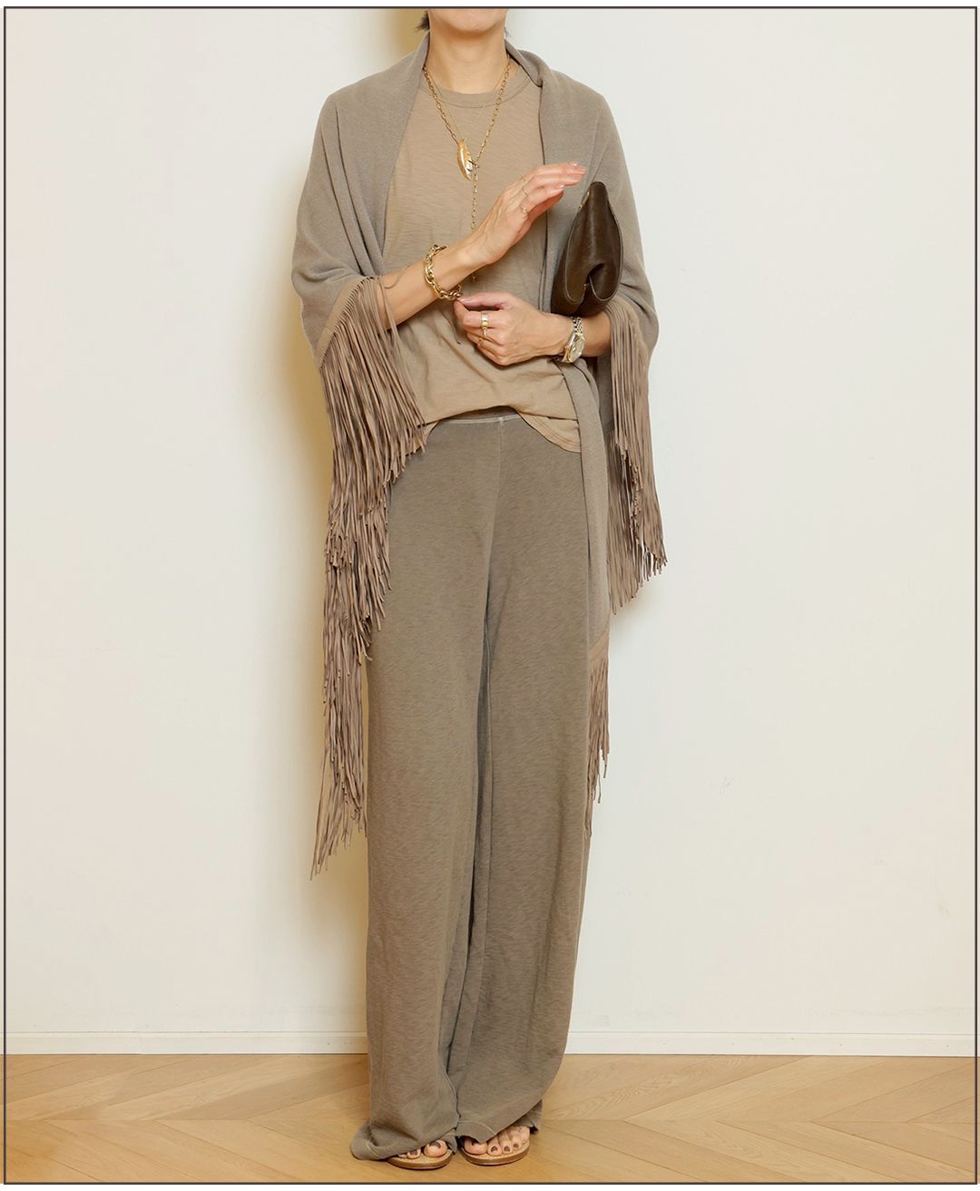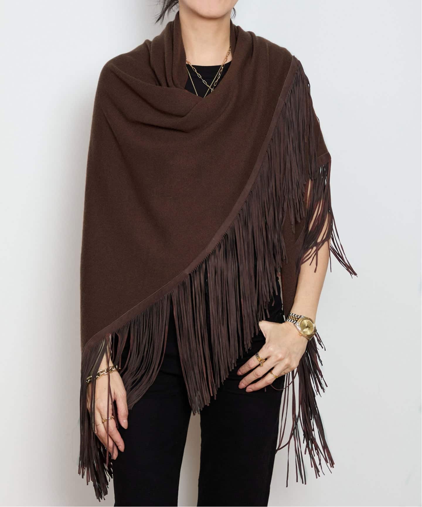 薄手のカシミヤ素材に、スウェードフリンジをあしらった定番ストール。