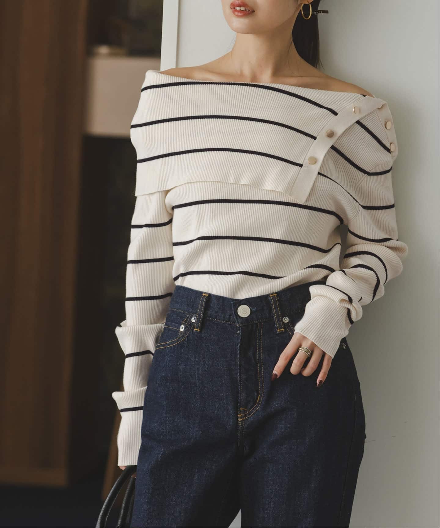 くるりと折り返したトップにキラリ煌めくゴールドボタンを合わせた、これ1枚でサマになるリブニットプルオーバー。