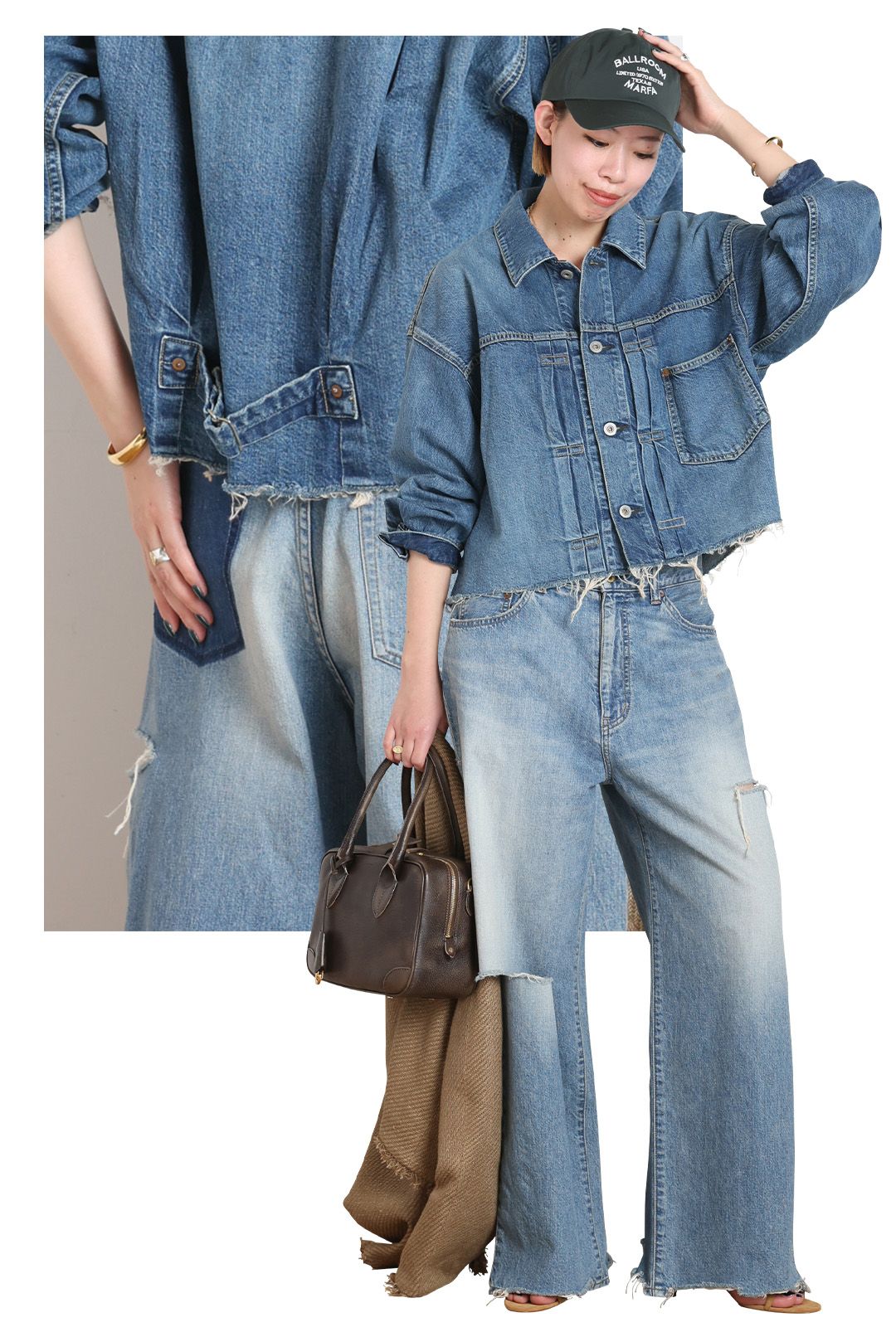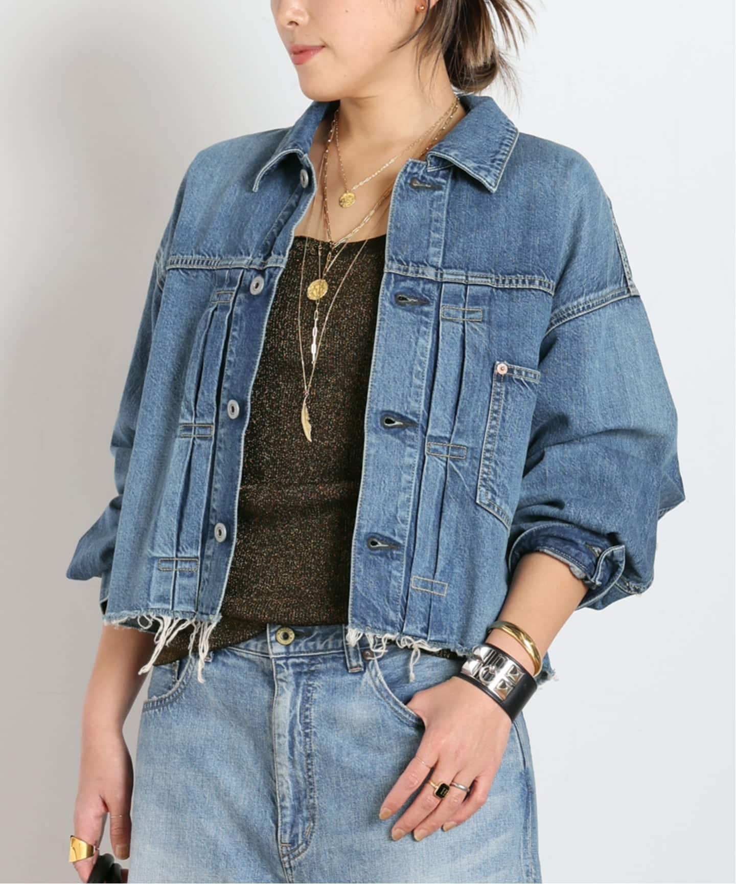 クロップド丈の裾はカットオフになっており、着こなしのさりげないアクセ ントに。