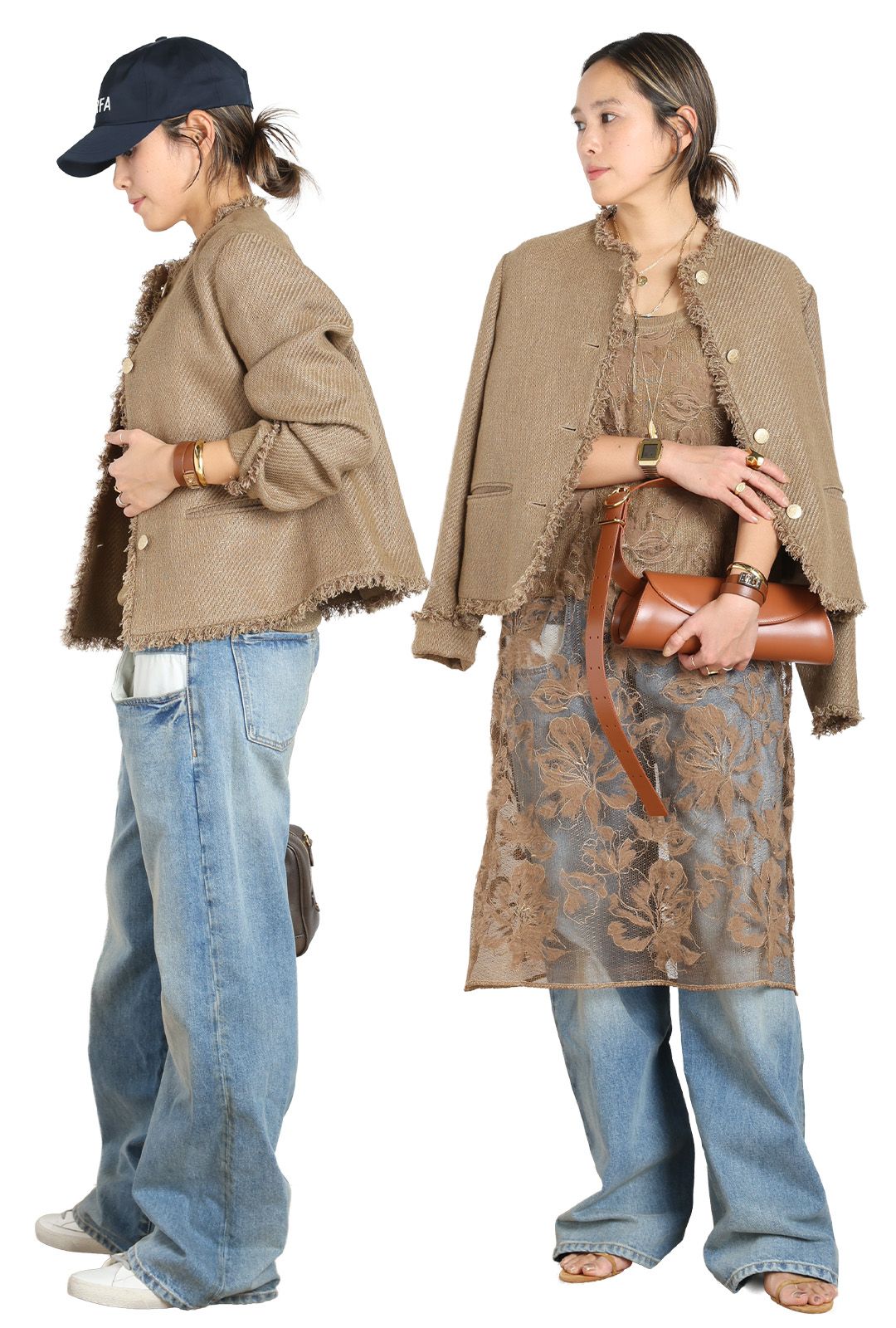 コンパクト目なシンプルなボクシーシルエットに、金釦とフリンジが目を惹く。