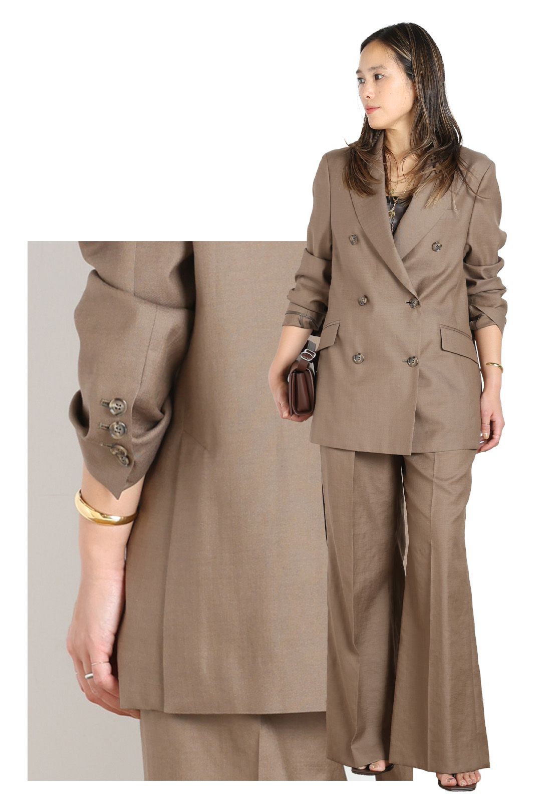 同じ生地を使用したパンツもあり、セットアップスタイルも楽しめる。