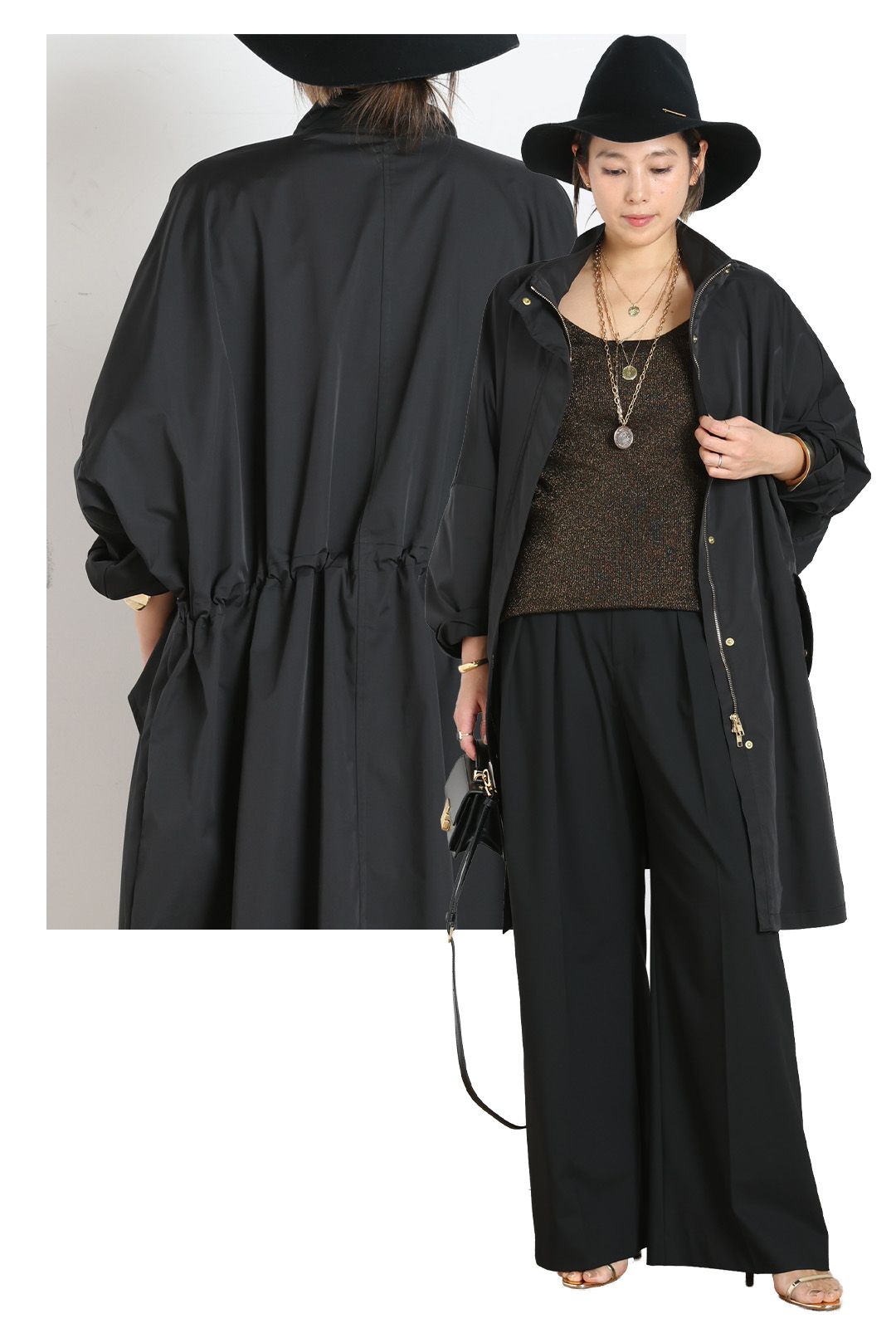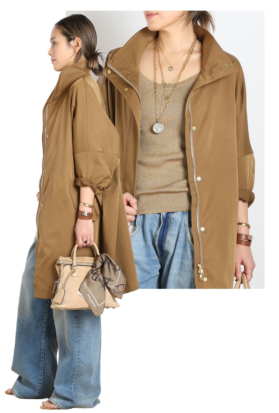 フロントはダブルジップの仕様で、着方を調整すればパンツはもちろん、スカ ートでもバランスよく着こなせる。