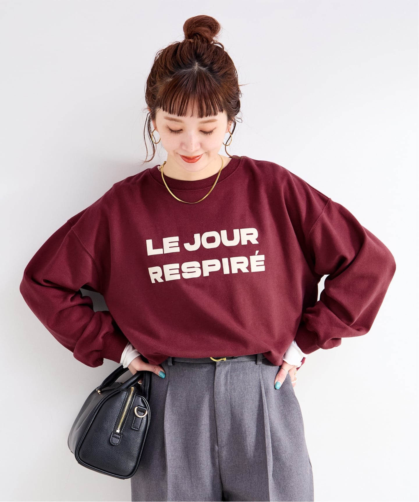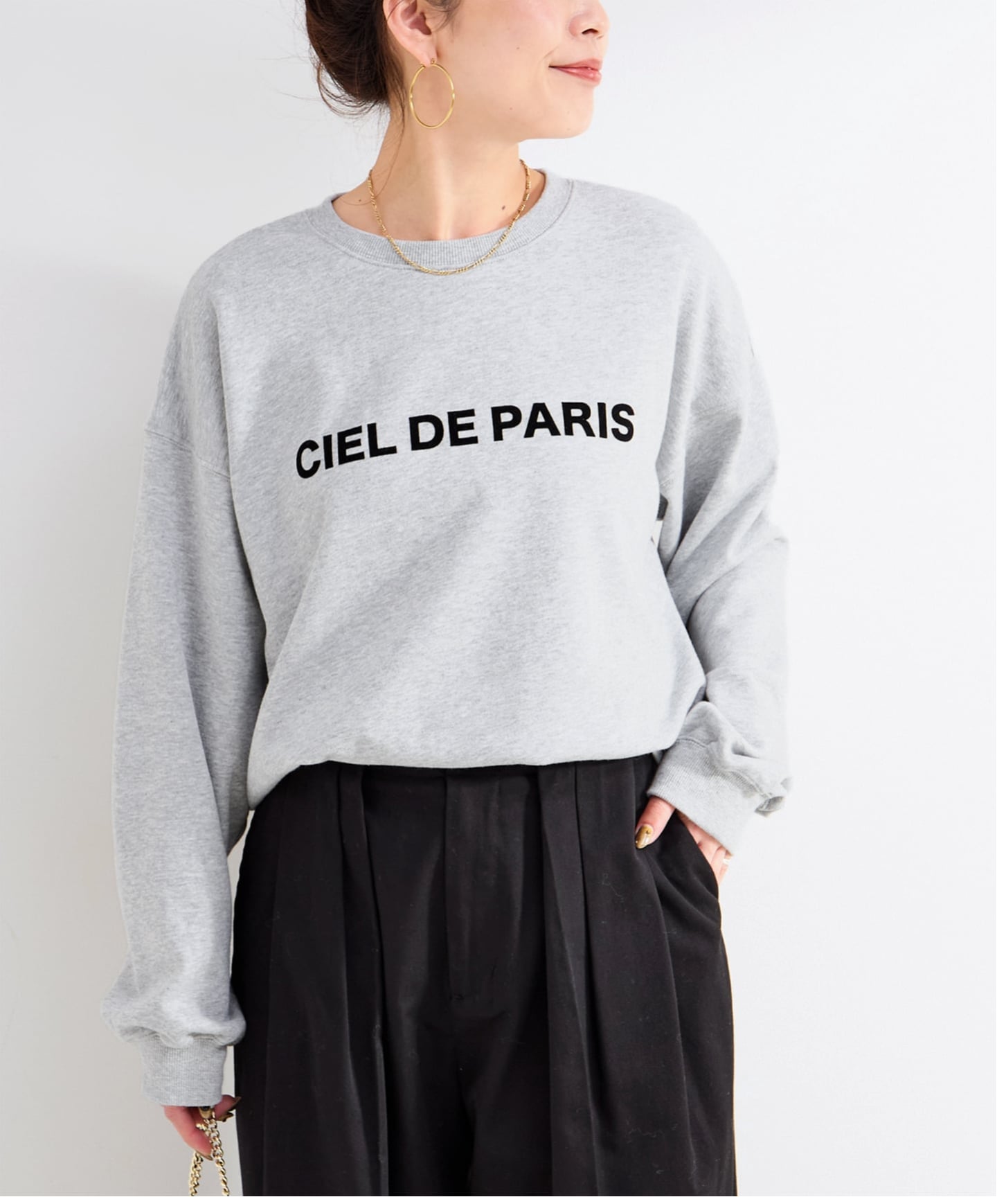 顔まわりがすっきり見えて、スウェットでもラフになりすぎない一枚です。