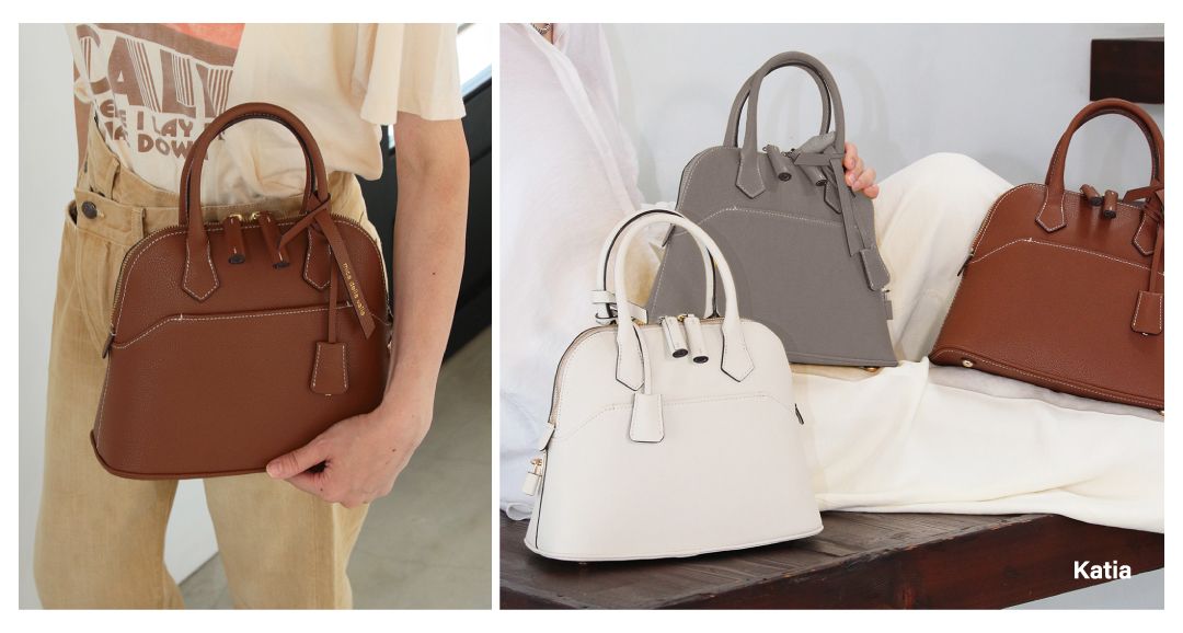 人気モデルの「Katia」は、斜めがけにも丁度いいサイズ感のミニボストン。表面にシュリンクのエンボス加工を施したレザーを使用し、高級感もありつつ、汚れや傷が目立ちにくいのも嬉しいポイント。前、背側ともにスマホや小物が取り出しやすいオープンのスリットポケットも気の利いたデザイン◎