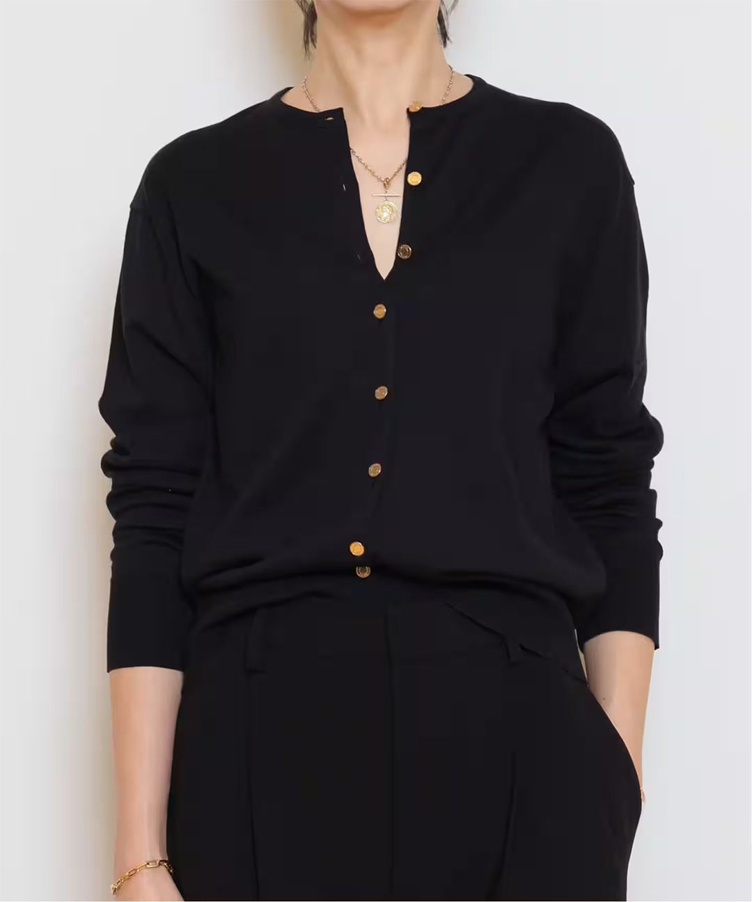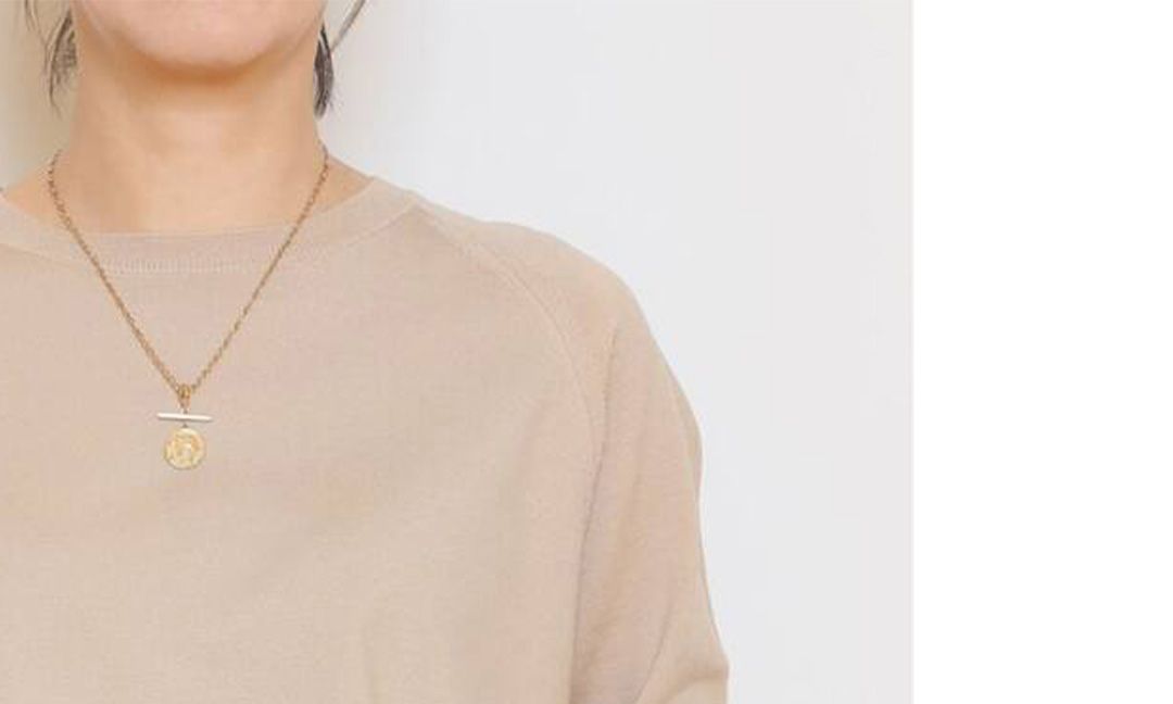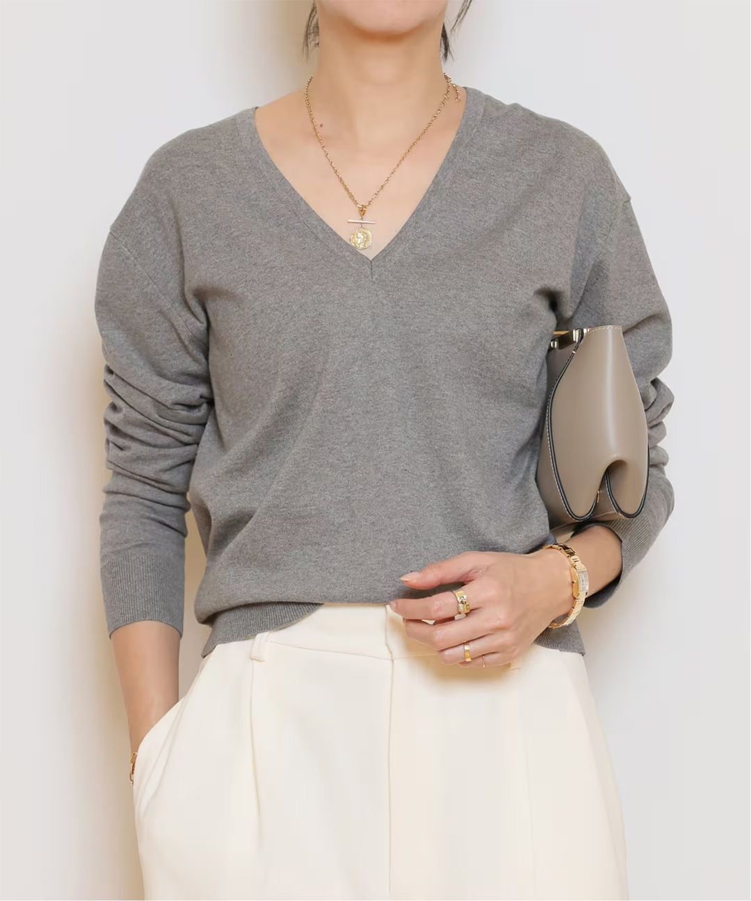 アクセサリーも美しく映える、計算された首元です。