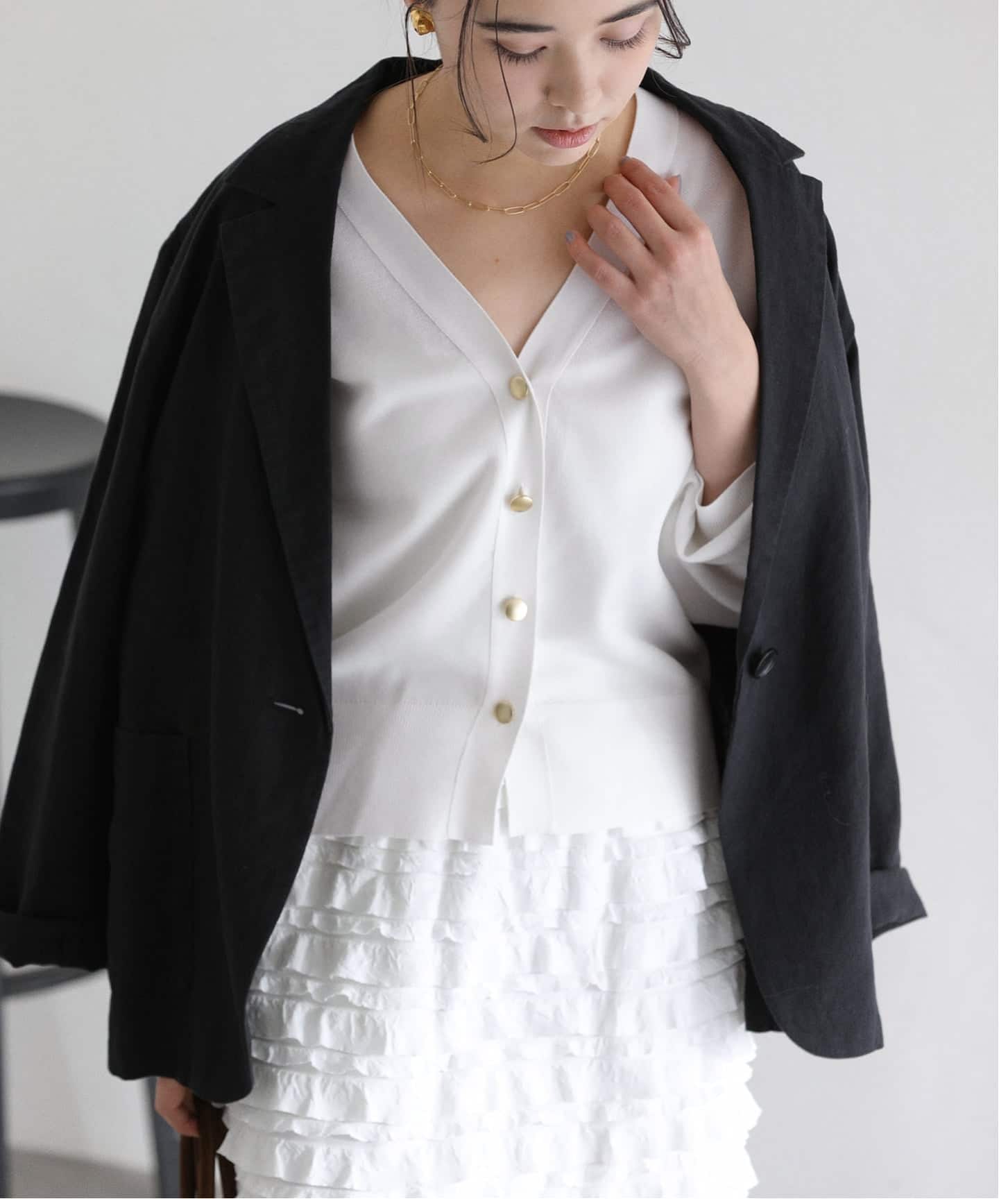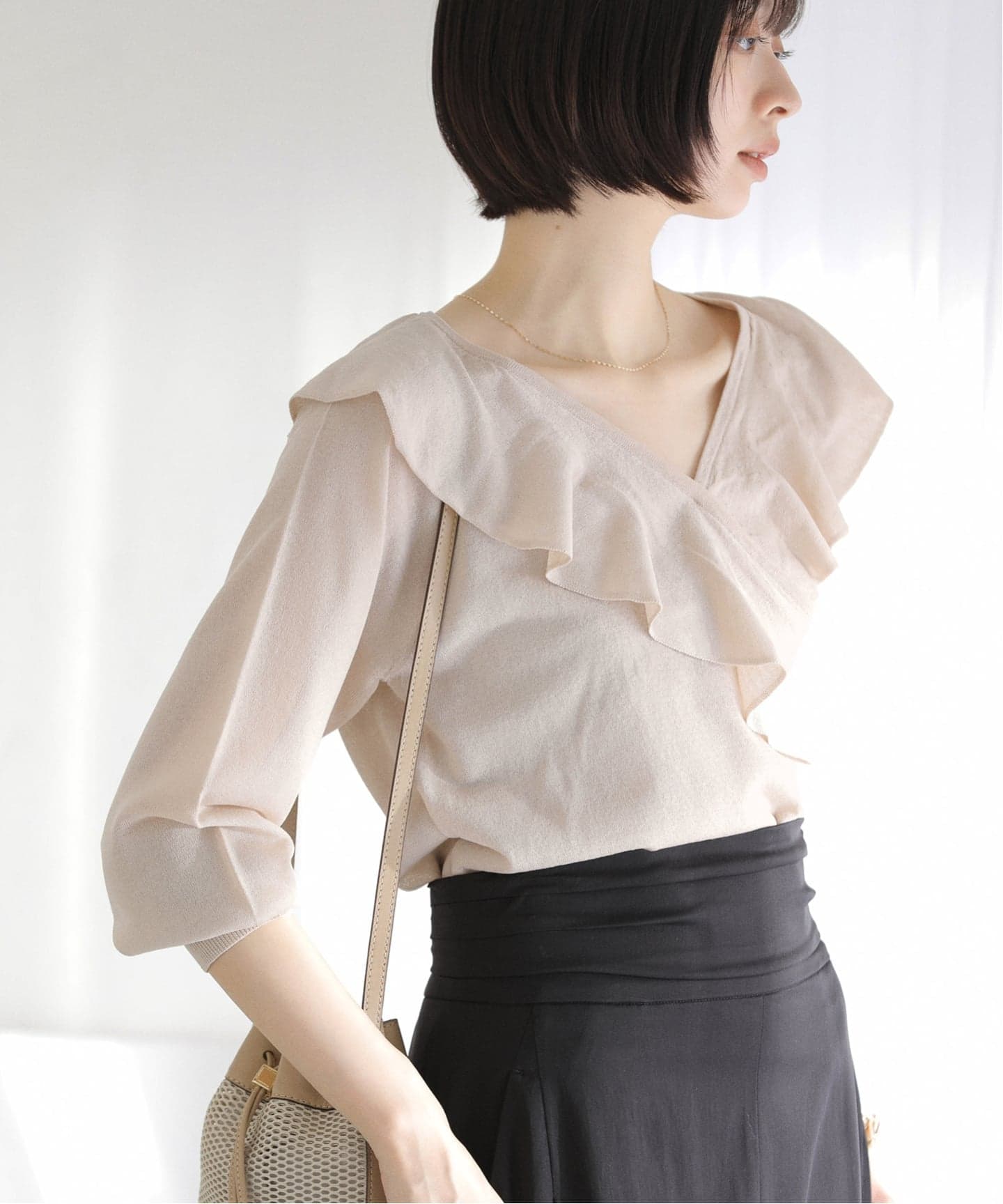 程よく開いたVネックに重なるフリルが甘くなりすぎず、大人の女性らしいバランスに仕上げています。
