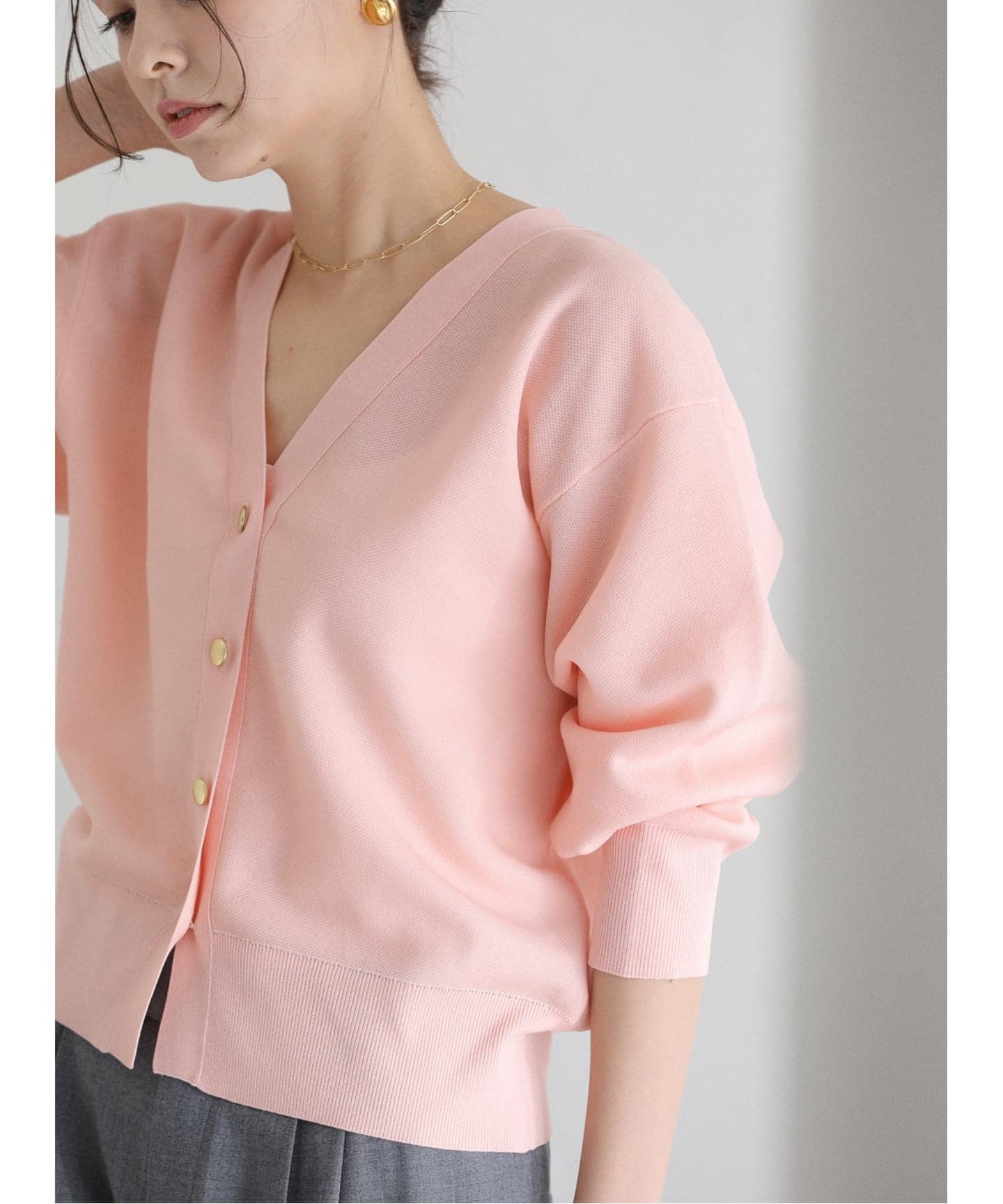 すっきりとしたVネックに上品なゴールド釦がさりげないアクセントになります。