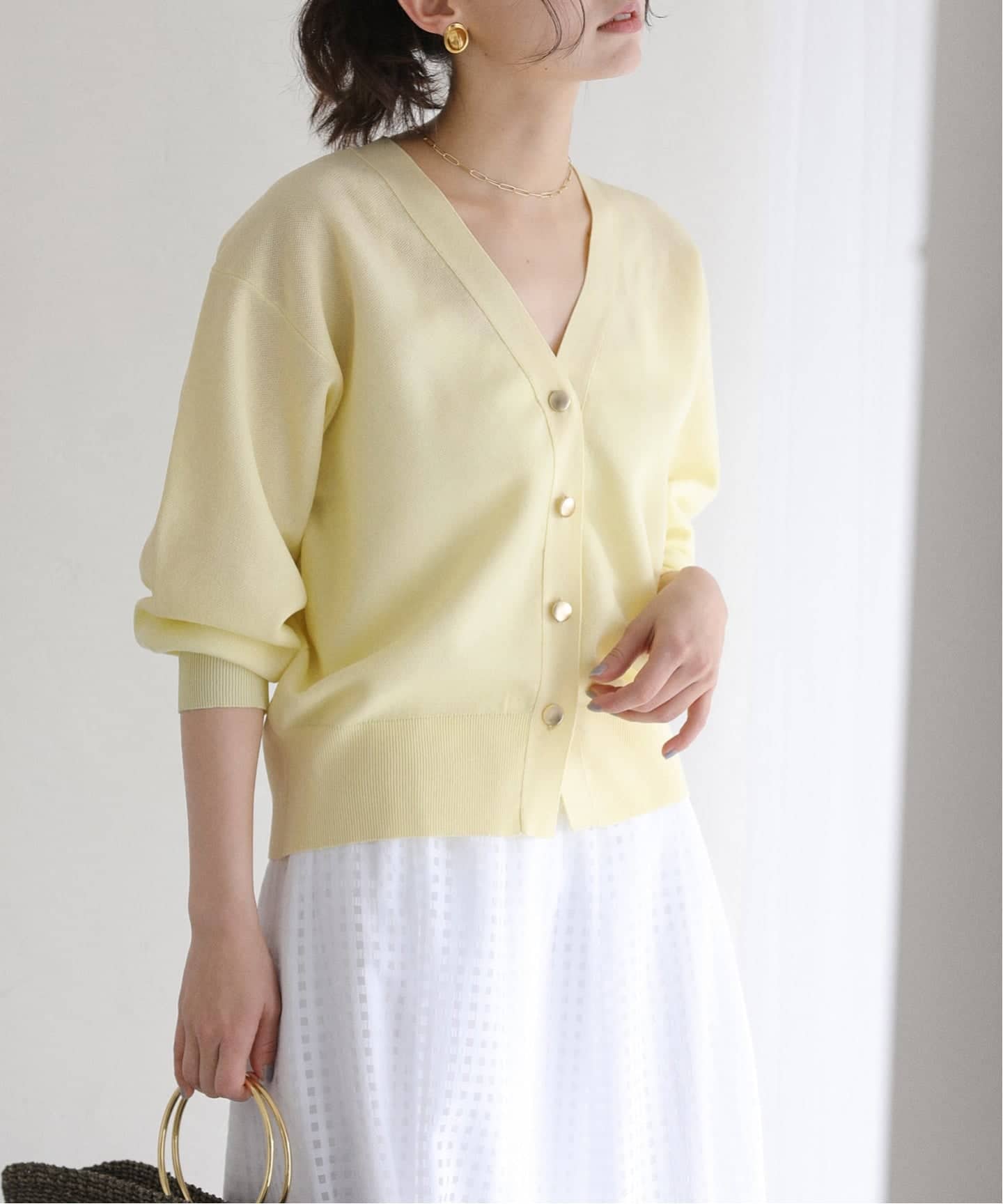 ほんのりシアー感のあるシーズンムード漂うVネックカーディガン。