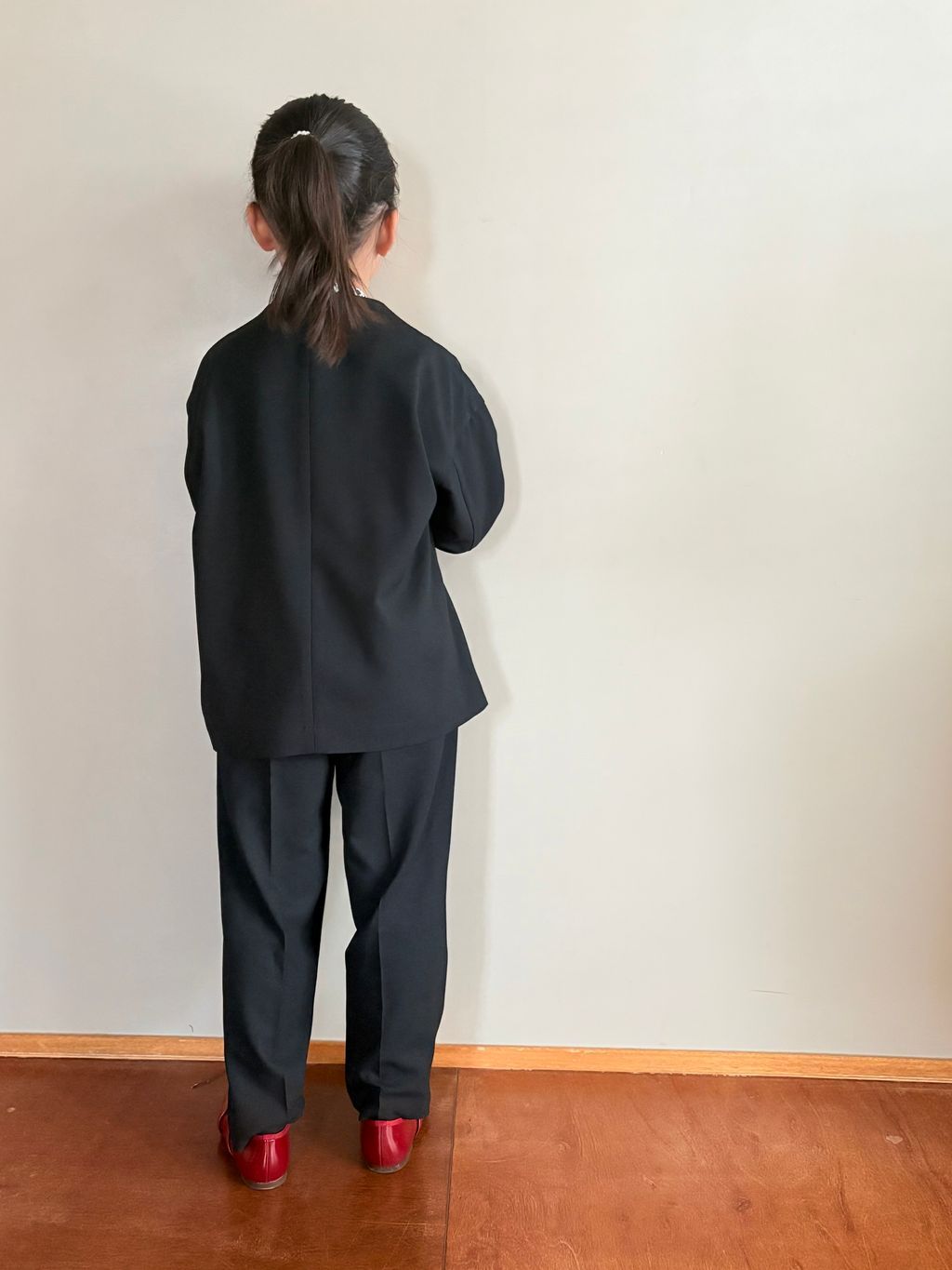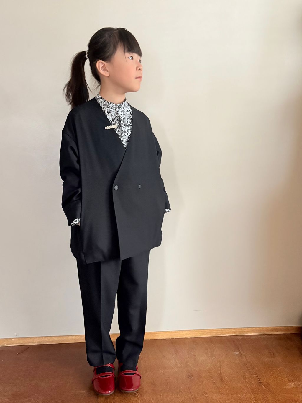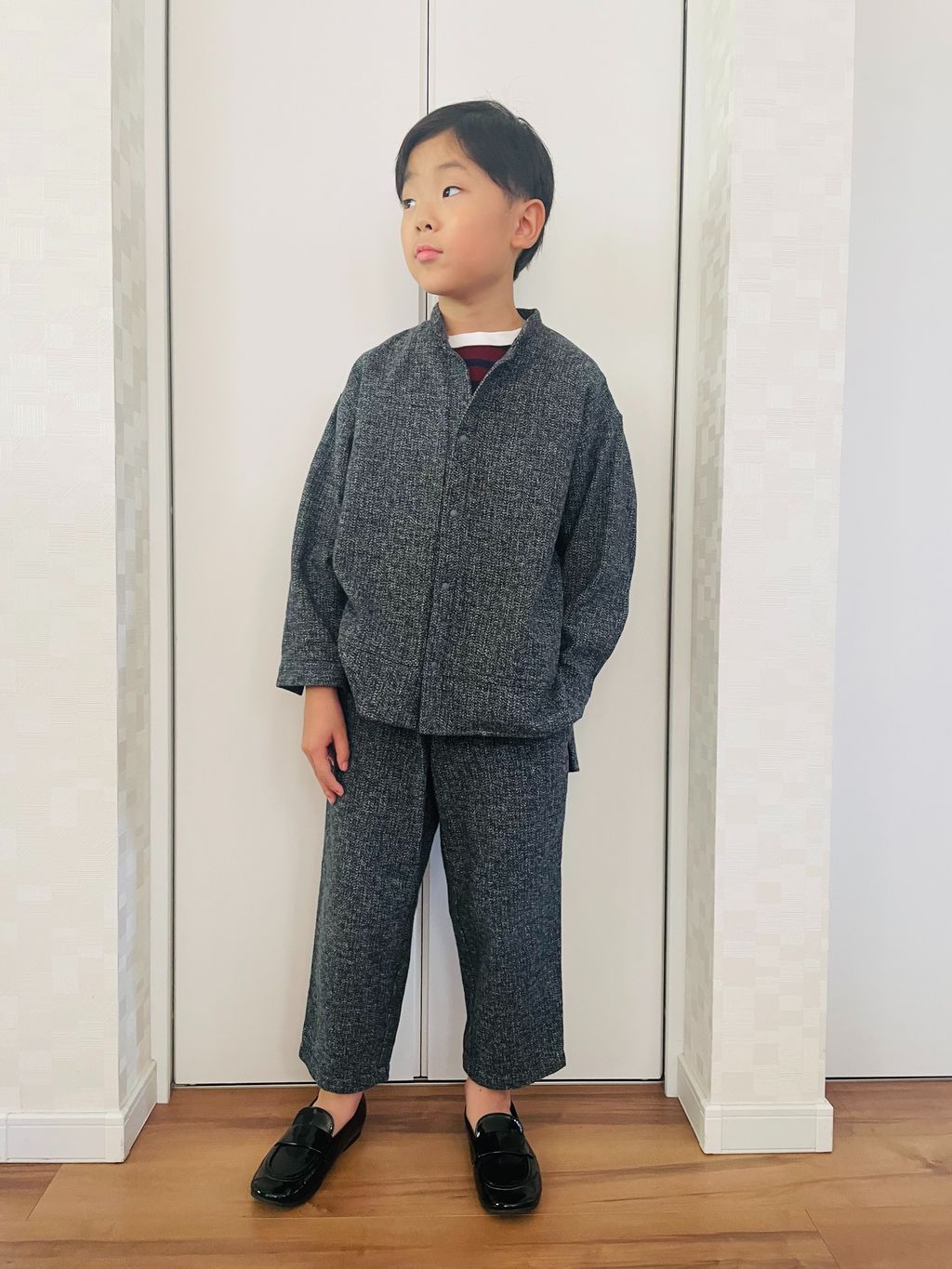 身長117cmで袖丈が少し長め、ビッグジャケット風になりました。パンツの丈も少し長めですが、高めの位置でウエストの紐を絞れば問題なさそうです。