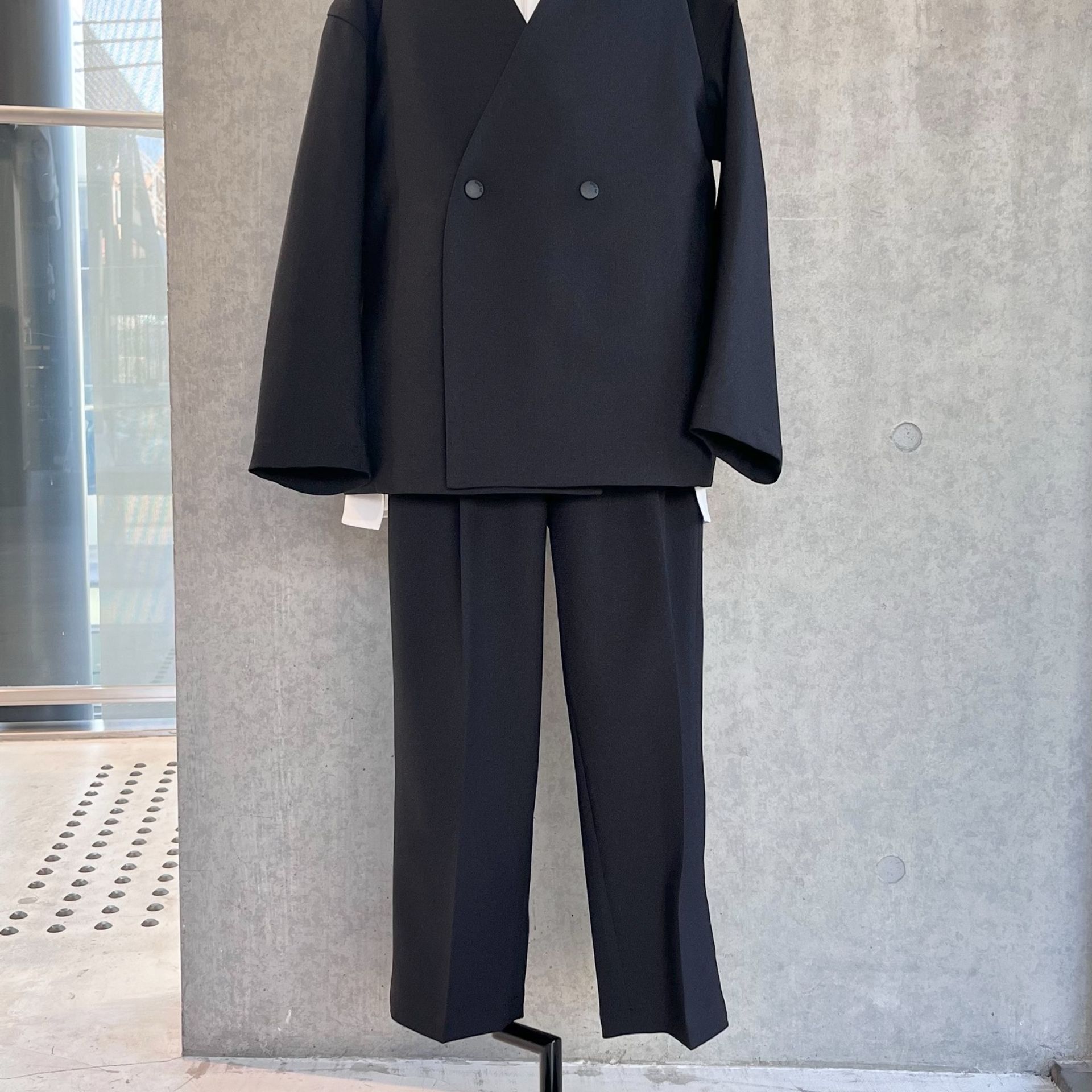 程よい光沢のある機能素材を使用し、普段着としてはもちろん、オケージョンでも着用できるきちんとした雰囲気のノーカラージャケット。
